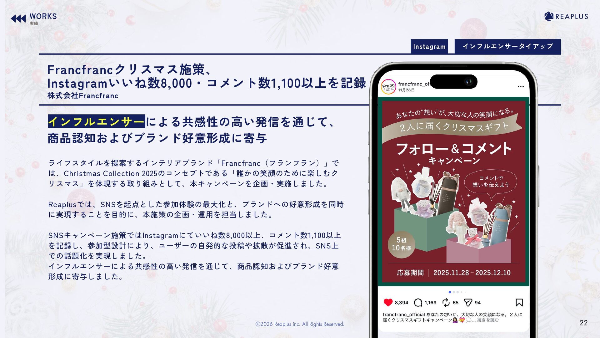 リスマス」を体現する取り組みとして、本キャンペーンを企画・実施しました。 Reaplusでは、SNSを起点とした参加体験の最大化と、ブランドへの好意形成を同時 に実現することを目的に、本施策の企画・運用を担当しました。 SNSキャンペーン施策ではInstagramにていいね数8,000以上、コメント数1,100以上 を記録し、参加型設計により、ユーザーの自発的な投稿や拡散が促進され、SNS上 での話題化を実現しました。 インフルエンサーによる共感性の高い発信を通じて、商品認知およびブランド好意 形成に寄与しました。 株式会社Francfranc WORKS 実績 22 Ⓒ2026 Reaplus inc. All Rights Reserved.