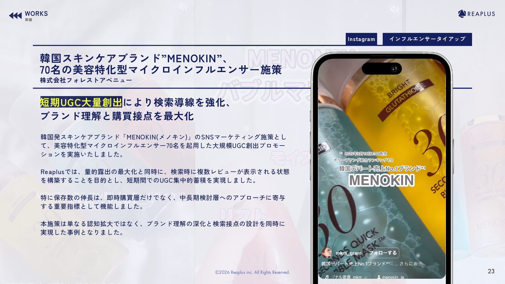 12. インフルエンサータイアップ Instagram 韓国スキンケアブランド”MENOKIN”、 70名の美容特化型マイクロインフルエンサー施策 短期UGC大量創出により検索導線を強化、 ブランド理解と購買接点を最大化 韓国発スキンケアブランド「MENOKIN(メノキン)」のSNSマーケティング施策とし て、美容特化型マイクロインフルエンサー70名を起用した大規模UGC創出プロモー ションを実施いたしました。 Reaplusでは、量的露出の最大化と同時に、検索時に複数レビューが表示される状態
