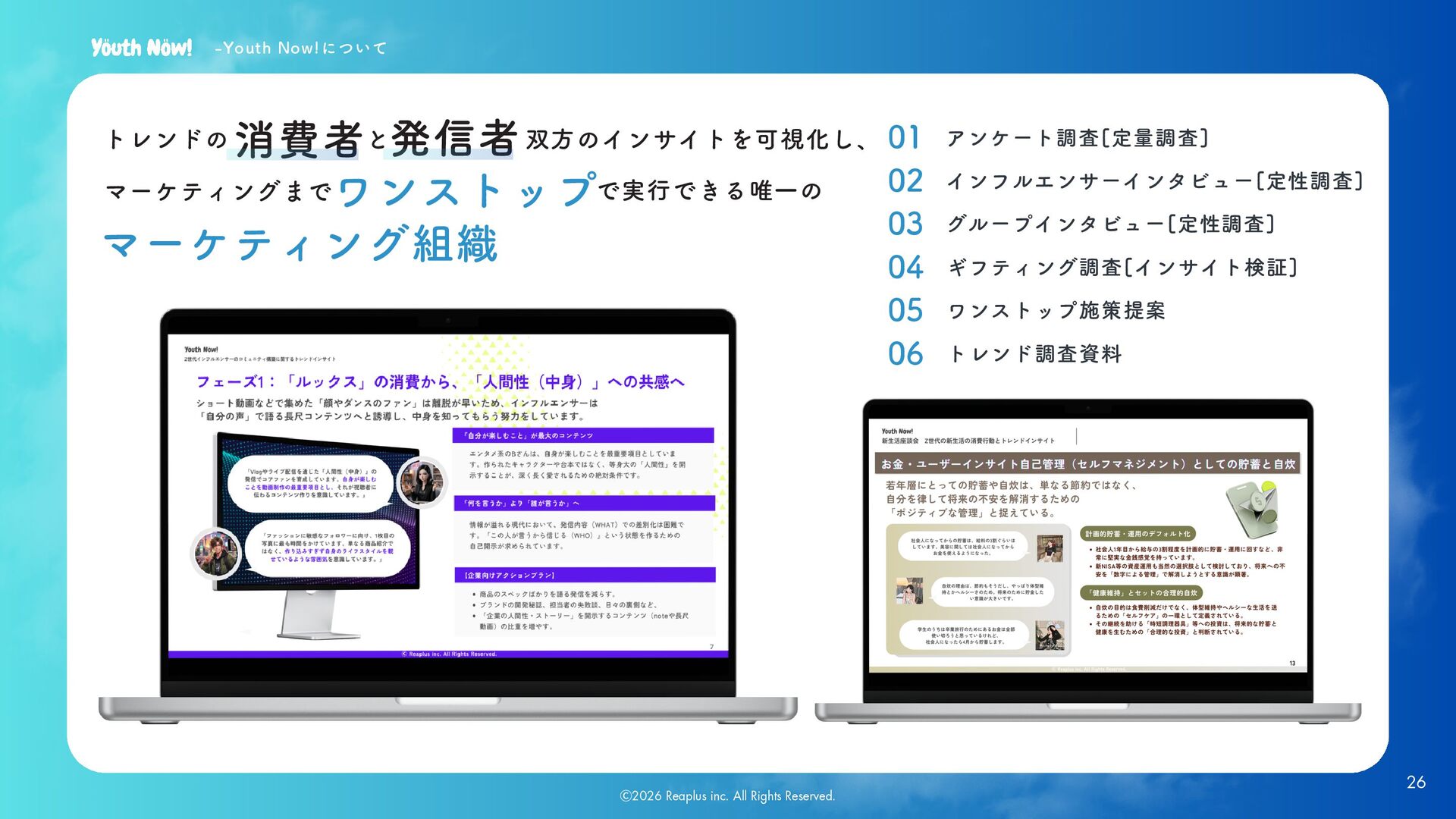 06 マーケティング組織 ワンストップ -Youth Now!について アンケート調査[定量調査] 01 インフルエンサーインタビュー[定性調査] 02 と 双方のインサイトを可視化し、 マーケティングまで で実行できる唯一の 26 Ⓒ2026 Reaplus inc. All Rights Reserved.