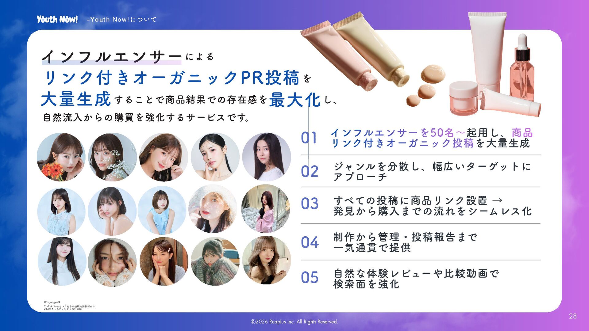 05 大量生成 リンク付きオーガニックPR投稿 -Youth Now!について 起用し、 を大量生成 インフルエンサーを50名〜 インフルエンサーを50名〜 商品 リンク付きオーガニック投稿 商品 リンク付きオーガニック投稿 01 ジャンルを分散し、幅広いターゲットに アプローチ 02 による を することで商品結果での存在感を最大化し、 自然流入からの購買を強化するサービスです。 Wonjungyo様 TikTok Shopリンク付きの投稿を弊社経由で 213名キャスティングを行い実施。 28 Ⓒ2026 Reaplus inc. All Rights Reserved.