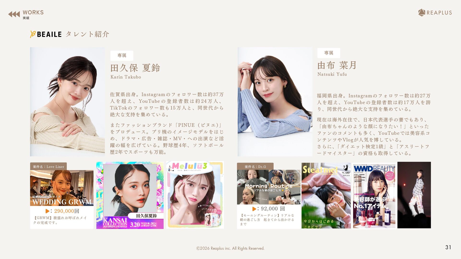 を 超 え 、 YouTube の 登 録 者 数 は 約 24 万 人 、 TikTokのフォロワー数も15万人と、同世代から 絶大な支持を集めている。 田久保 夏鈴 またファッションブランド「PINUE(ピヌエ) 」 をプロデュース。プリ機のイメージモデルをはじ め、ドラマ・広告・雑誌・MV・への出演など活 躍の幅を広げている。野球歴4年、ソフトボール 歴2年でスポーツも万能。 Karin Takubo 福岡県出身。Instagramのフォロワー数は約27万 人を超え、YouTubeの登録者数は約17万人を誇 り、同世代から絶大な支持を集めている。 由布 菜月 現在は海外在住で、日本代表選手の妻でもあり、 「由布ちゃんのような顔になりたい!」といった ファンのコメントも多く、YouTubeでは美容系コ ンテンツやVlogが人気を博している。 さらに、 「ダイエット検定1級」と「アスリートフ ードマイスター」の資格も取得している。 Natsuki Yufu 【GRWM】激盛れお呼ばれメイ クの完成です。 【モーニングルーティン】リアルな 朝の過ごし方☀️起きてから出かける まで🏃‍♀️ タレント紹介 WORKS 実績 31 Ⓒ2026 Reaplus inc. All Rights Reserved.