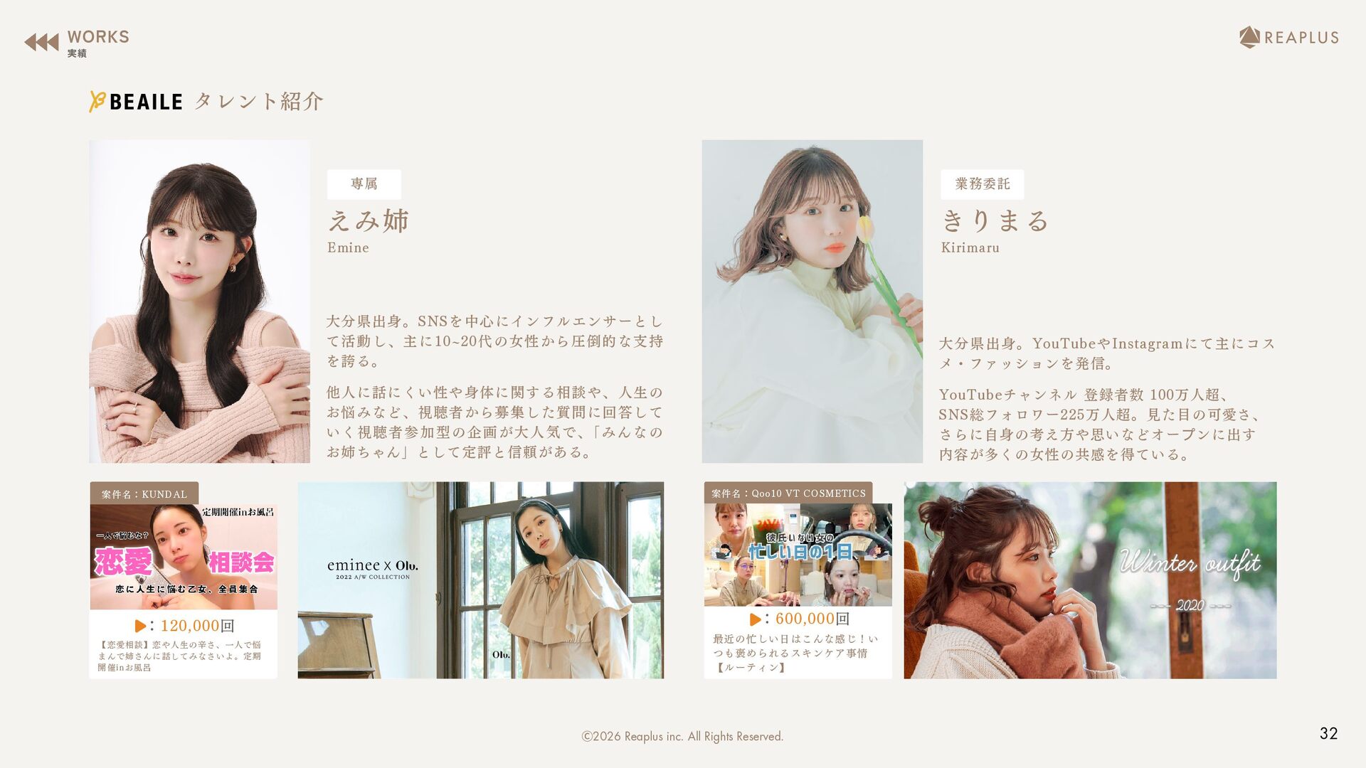 を誇る。 えみ姉 他人に話にくい性や身体に関する相談や、人生の お悩みなど、視聴者から募集した質問に回答して いく視聴者参加型の企画が大人気で、 「みんなの お姉ちゃん」として定評と信頼がある。 Emine 大分県出身。YouTubeやInstagramにて主にコス メ・ファッションを発信。 きりまる YouTubeチャンネル 登録者数 100万人超、 SNS総フォロワー225万人超。見た目の可愛さ、 さらに自身の考え方や思いなどオー プンに出す 内容が多くの女性の共感を得ている。 Kirimaru 【恋愛相談】恋や人生の辛さ、一人で悩 まんで姉さんに話してみなさいよ。定期 開催inお風呂🛁 最近の忙しい日はこんな感じ!い つも褒められるスキンケア事情 【ルーティン】 タレント紹介 WORKS 実績 32 Ⓒ2026 Reaplus inc. All Rights Reserved.