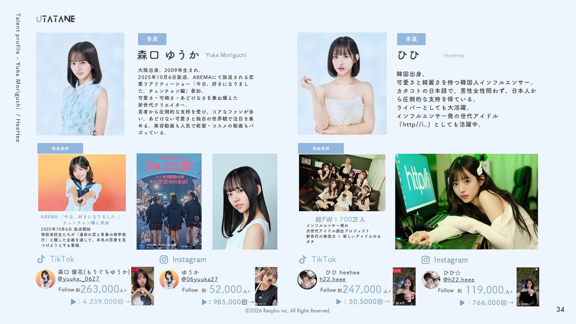 可愛さ・可憐さ・あどけなさを兼ね備えた 新世代クリエイター。 若者から圧倒的な支持を受け、コアなファンが多 い。あどけない可愛さと独自の世界観で注目を集 める。美容動画も人気で前髪・コスメの動画もバ ズっている。 森口 ゆうか Instagram @06yuuka27 約 ゆうか 52,000人+ Follow インフルエンサー発の 次世代アイドル創出プロジェクト 新世代の発信力 × 新しいアイドルのカ タチ 総FW:700万人 TikTok h22.heee 約 🙂ひひ heehee🙂 247,000 人+ Follow 2025年10月6日 放送開始 現役高校生たちが「運命の恋と青春の修学旅 行」と題した企画を通して、本気の恋愛を見 つけようとする番組。 ABEMA 「今日、好きになりました。 」      チュンチョン編に参加 Talent profile - Yuka Moriguchi / HeeHee TikTok @yuuka._0627 約 森口 優花(もりぐちゆうか) 263,000人+ Follow :4,239,000回→ :985,000回→  HeeHee 韓国出身。 可愛さと綺麗さを持つ韓国人インフルエンサー。 カタコトの日本語で、男性女性問わず、日本人か ら圧倒的な支持を得ている。 ライバーとしても大活躍。 インフルエンサー発の世代アイドル 『http//i。 』としても活躍中。 ひひ :50,5000回→ Instagram @h22.heee 約 ひひ☆ 119,000人+ Follow :766,000回→ 34 Ⓒ2026 Reaplus inc. All Rights Reserved.