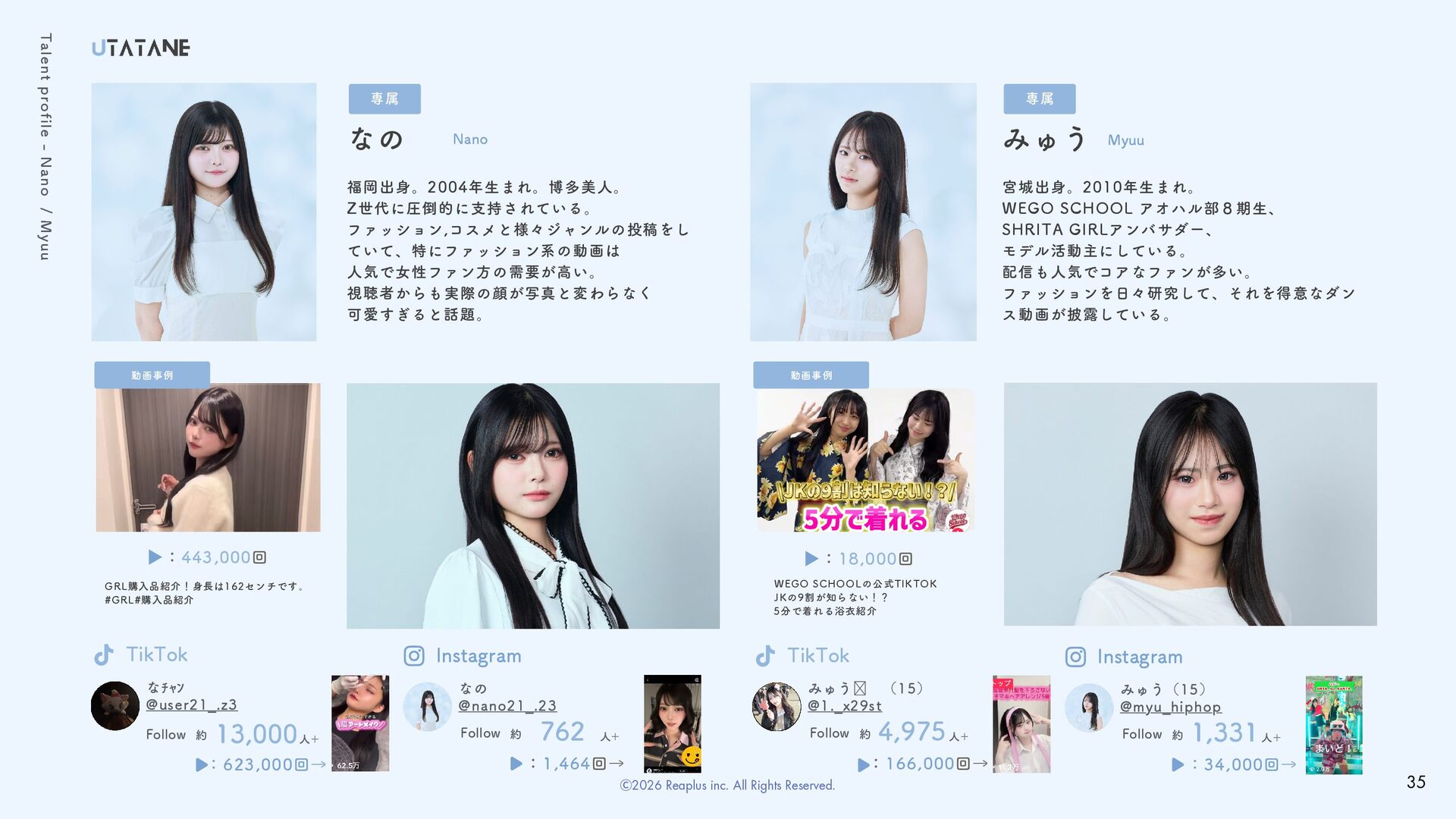 人気で女性ファン方の需要が高い。 視聴者からも実際の顔が写真と変わらなく 可愛すぎると話題。 宮城出身。2010年生まれ。 WEGO SCHOOL アオハル部8期生、 SHRITA GIRLアンバサダー、 モデル活動主にしている。 配信も人気でコアなファンが多い。 ファッションを日々研究して、それを得意なダン ス動画が披露している。 なの みゅう WEGO SCHOOLの公式TIKTOK JKの9割が知らない!? 5分で着れる浴衣紹介 ▶︎:18,000回 Talent profile - Nano / Myuu @user21_.z3 なチャン😼 @nano21_.23 約 なの 762 人+ Follow :1,464回→ @1._x29st 約 みゅう 😻(15) 4,975人+ Follow :166,000回→ @myu_hiphop 約 みゅう(15) 1,331人+ Follow :34,000回→ GRL購入品紹介!身長は162センチです。 #GRL#購入品紹介 ▶︎:443,000回 約 Follow :623,000回→ 13,000人+ TikTok Instagram TikTok Instagram 35 Ⓒ2026 Reaplus inc. All Rights Reserved.