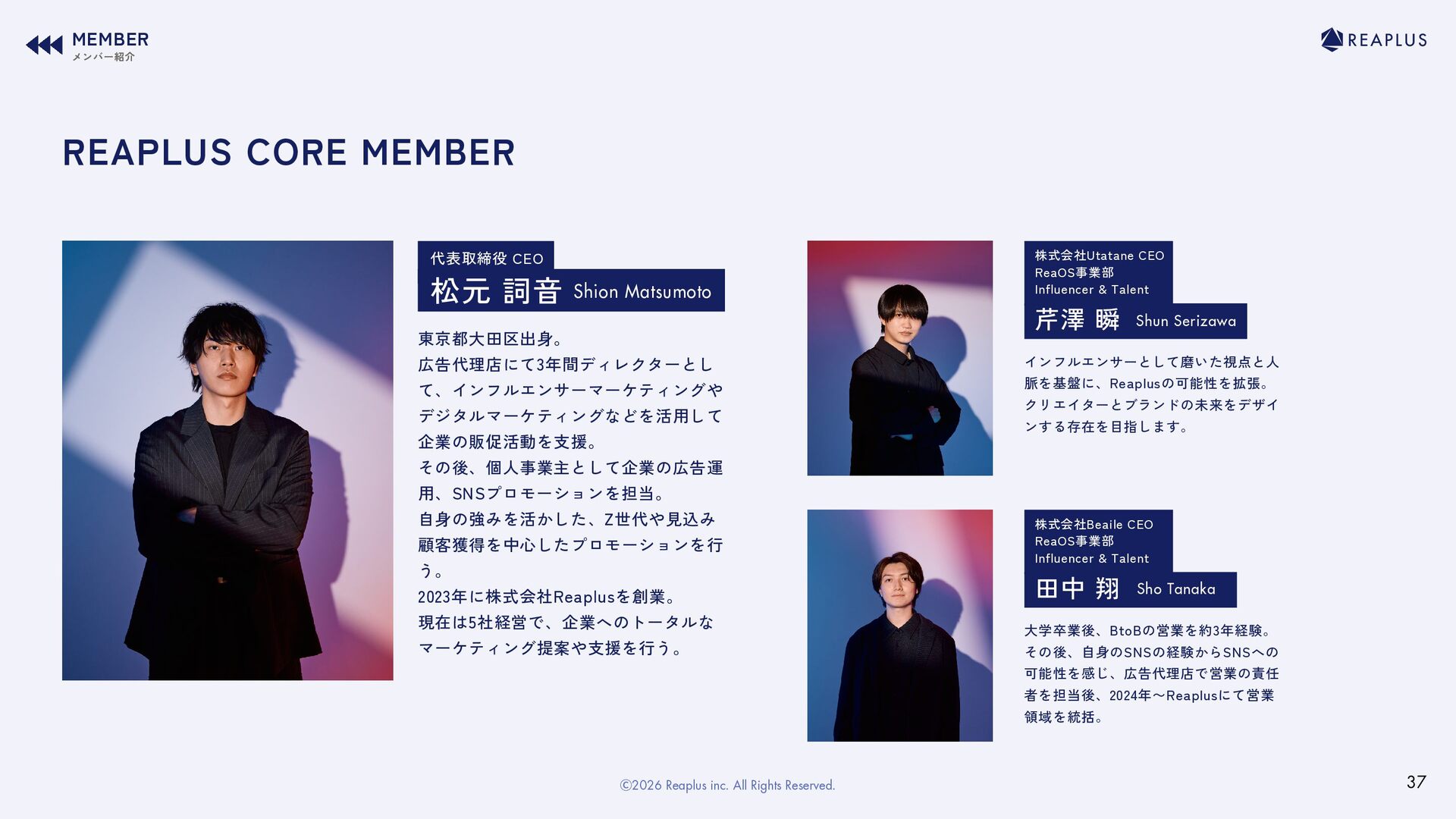 て、インフルエンサーマーケティングや デジタルマーケティングなどを活用して 企業の販促活動を支援。 その後、個人事業主として企業の広告運 用、SNSプロモーションを担当。 自身の強みを活かした、Z世代や見込み 顧客獲得を中心したプロモーションを行 う。 2023年に株式会社Reaplusを創業。 現在は5社経営で、企業へのトータルな マーケティング提案や支援を行う。 芹澤 瞬 株式会社Utatane CEO ReaOS事業部 Influencer & Talent Shun Serizawa インフルエンサーとして磨いた視点と人 脈を基盤に、Reaplusの可能性を拡張。 クリエイターとブランドの未来をデザイ ンする存在を目指します。 田中 翔 株式会社Beaile CEO ReaOS事業部 Influencer & Talent Sho Tanaka 大学卒業後、BtoBの営業を約3年経験。 その後、自身のSNSの経験からSNSへの 可能性を感じ、広告代理店で営業の責任 者を担当後、2024年〜Reaplusにて営業 領域を統括。 REAPLUS CORE MEMBER 37 Ⓒ2026 Reaplus inc. All Rights Reserved.