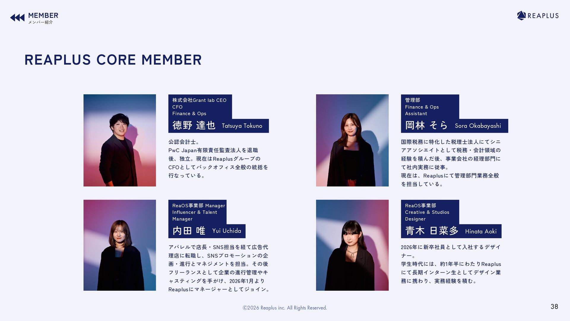 Okabayashi 国際税務に特化した税理士法人にてシニ アアソシエイトとして税務・会計領域の 経験を積んだ後、事業会社の経理部門に て社内実務に従事。 現在は、Reaplusにて管理部門業務全般 を担当している。 青木 日菜多 ReaOS事業部 Creative & Studios Designer Hinata Aoki 2026年に新卒社員として入社するデザイ ナー。 学生時代には、約1年半にわたりReaplus にて長期インターン生としてデザイン業 務に携わり、実務経験を積む。 徳野 達也 株式会社Grant lab CEO CFO Finance & Ops Tatsuya Tokuno 公認会計士。 PwC Japan有限責任監査法人を退職 後、独立。現在はReaplusグループの CFOとしてバックオフィス全般の統括を 行なっている。 内田 唯 ReaOS事業部 Manager Influencer & Talent Manager Yui Uchida アパレルで店長・SNS担当を経て広告代 理店に転職し、SNSプロモーションの企 画・進行とマネジメントを担当。その後 フリーランスとして企業の進行管理やキ ャスティングを手がけ、2026年1月より Reaplusにマネージャーとしてジョイン。 REAPLUS CORE MEMBER 38 Ⓒ2026 Reaplus inc. All Rights Reserved.