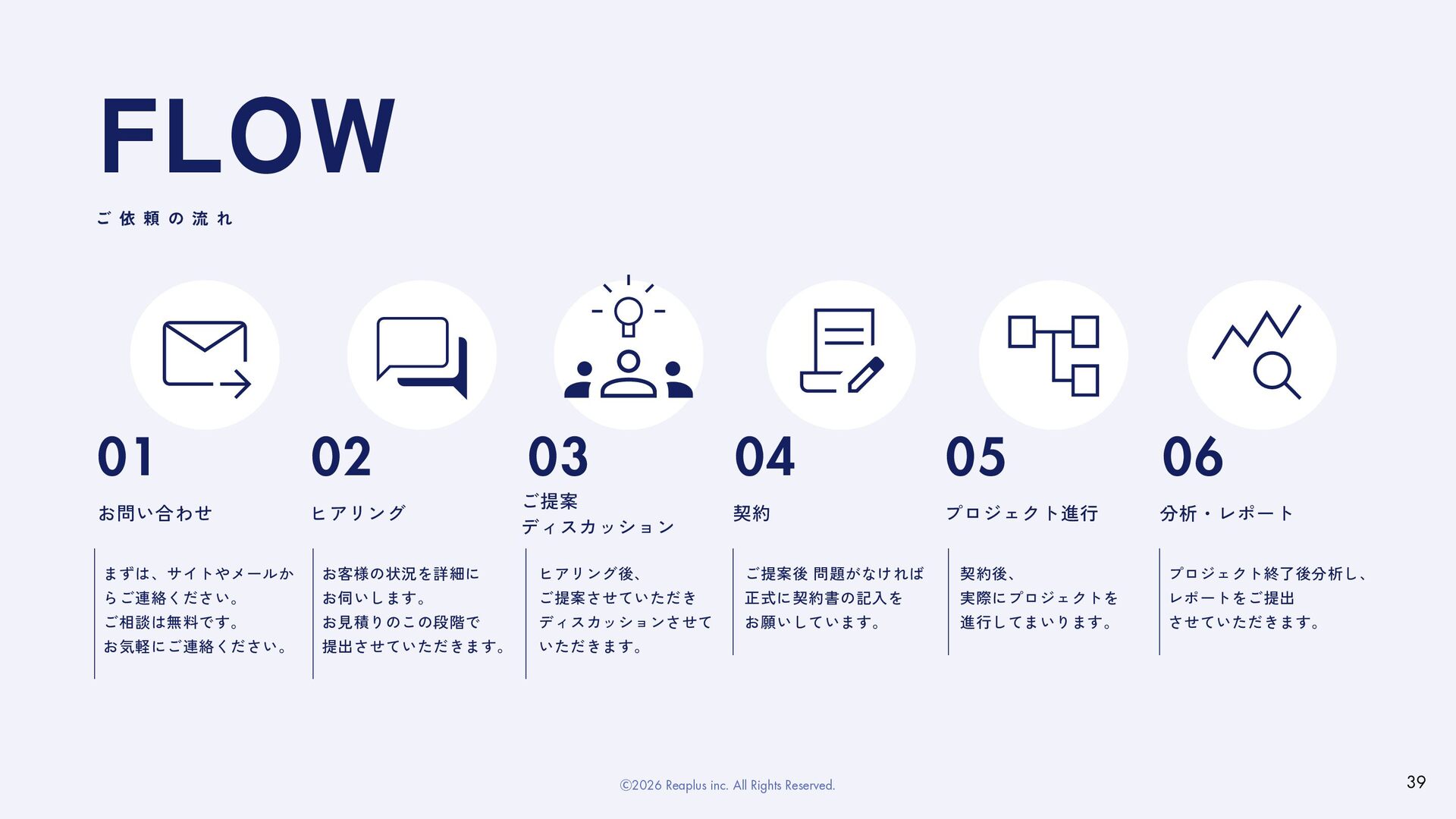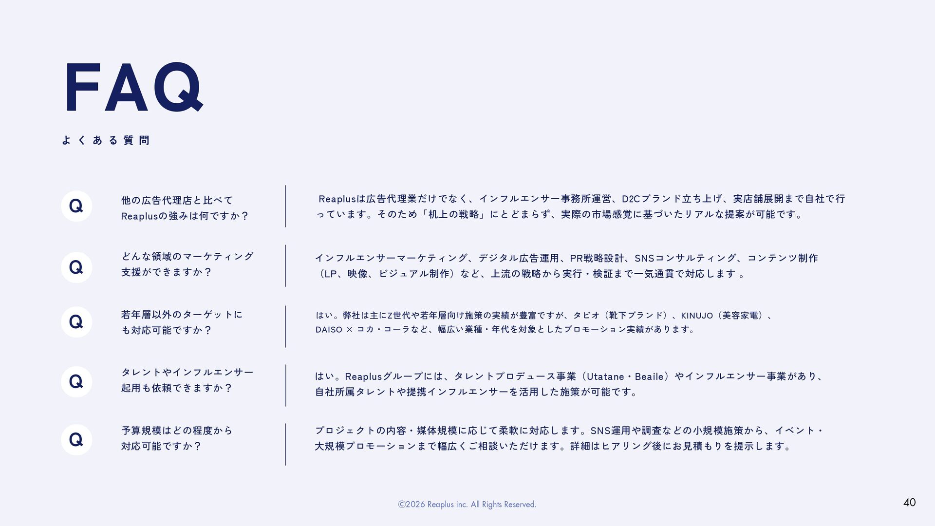 ディスカッションさせて いただきます。 契約後、 実際にプロジェクトを 進行してまいります。 ご提案後 問題がなければ 正式に契約書の記入を お願いしています。 プロジェクト終了後分析し、 レポートをご提出 させていただきます。 ご 依 頼 の 流 れ FLOW 01 03 02 04 06 05 お問い合わせ ご提案 ディスカッション ヒアリング 契約 分析・レポート プロジェクト進行 39 Ⓒ2026 Reaplus inc. All Rights Reserved.