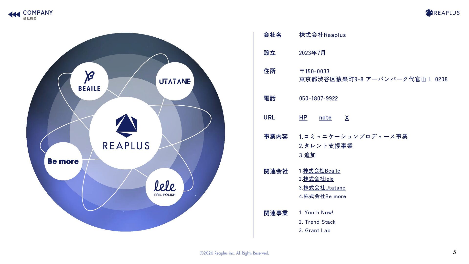 株式会社Reaplus 2023年7月 〒150-0033 東京都渋谷区猿楽町9-8 アーバンパーク代官山Ⅰ 0208 1.コミュニケーションプロデュース事業 2.タレント支援事業 3.追加 050-1807-9922 1.株式会社Beaile 3.株式会社Utatane 2.株式会社lele X 1. Youth Now! 4.株式会社Be more COMPANY 会社概要 5 3. Grant Lab 2. Trend Stack Ⓒ2026 Reaplus inc. All Rights Reserved.
