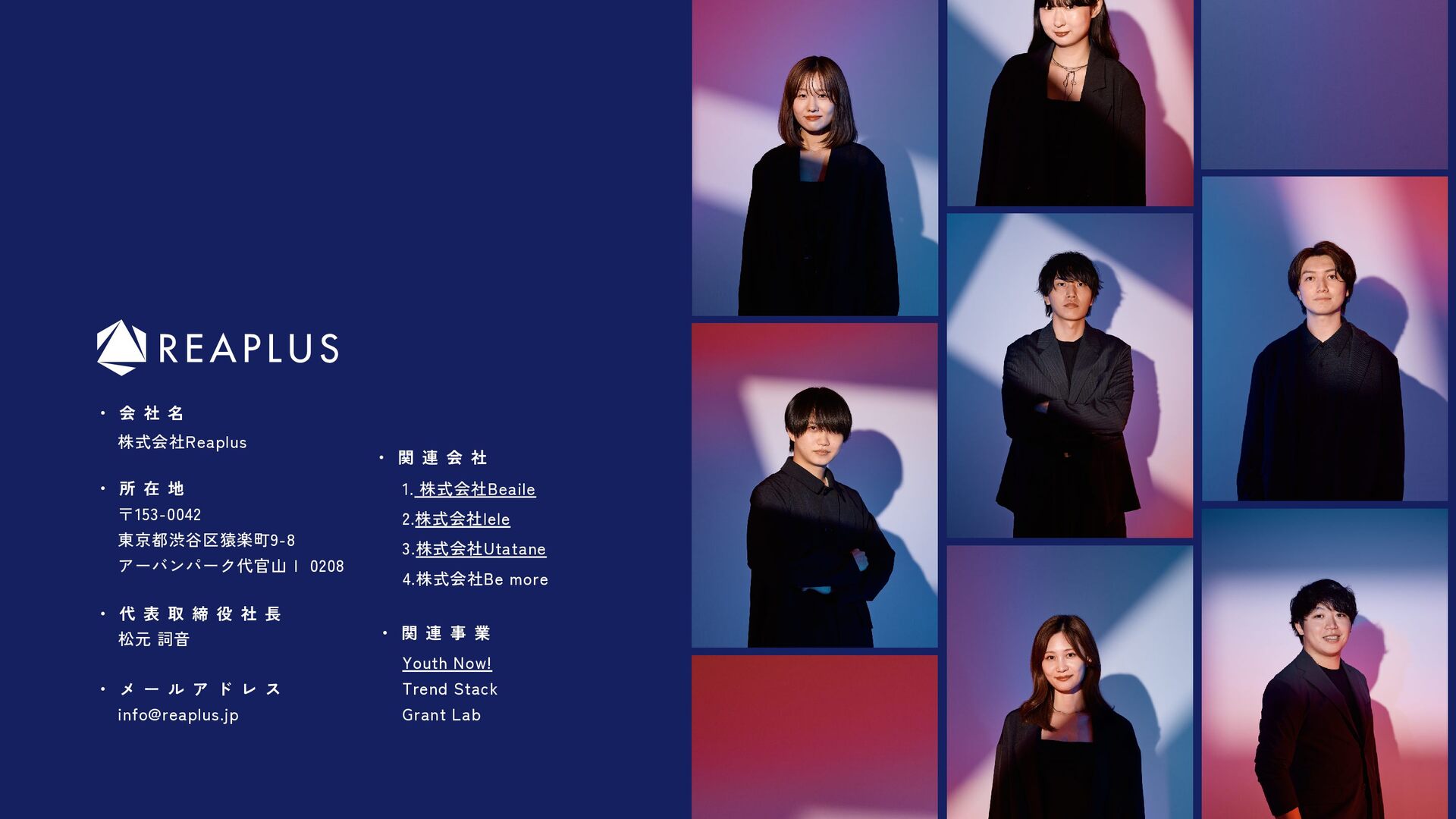 社 名 ・ 所 在 地 ・ 関 連 会 社 ・ 代 表 取 締 役 社 長 ・ 関 連 事 業 ・ メ ー ル ア ド レ ス 〒153-0042 東京都渋谷区猿楽町9-8 アーバンパーク代官山Ⅰ 0208 株式会社Reaplus 松元 詞音 [email protected] 1. 株式会社Beaile 3.株式会社Utatane 2.株式会社lele