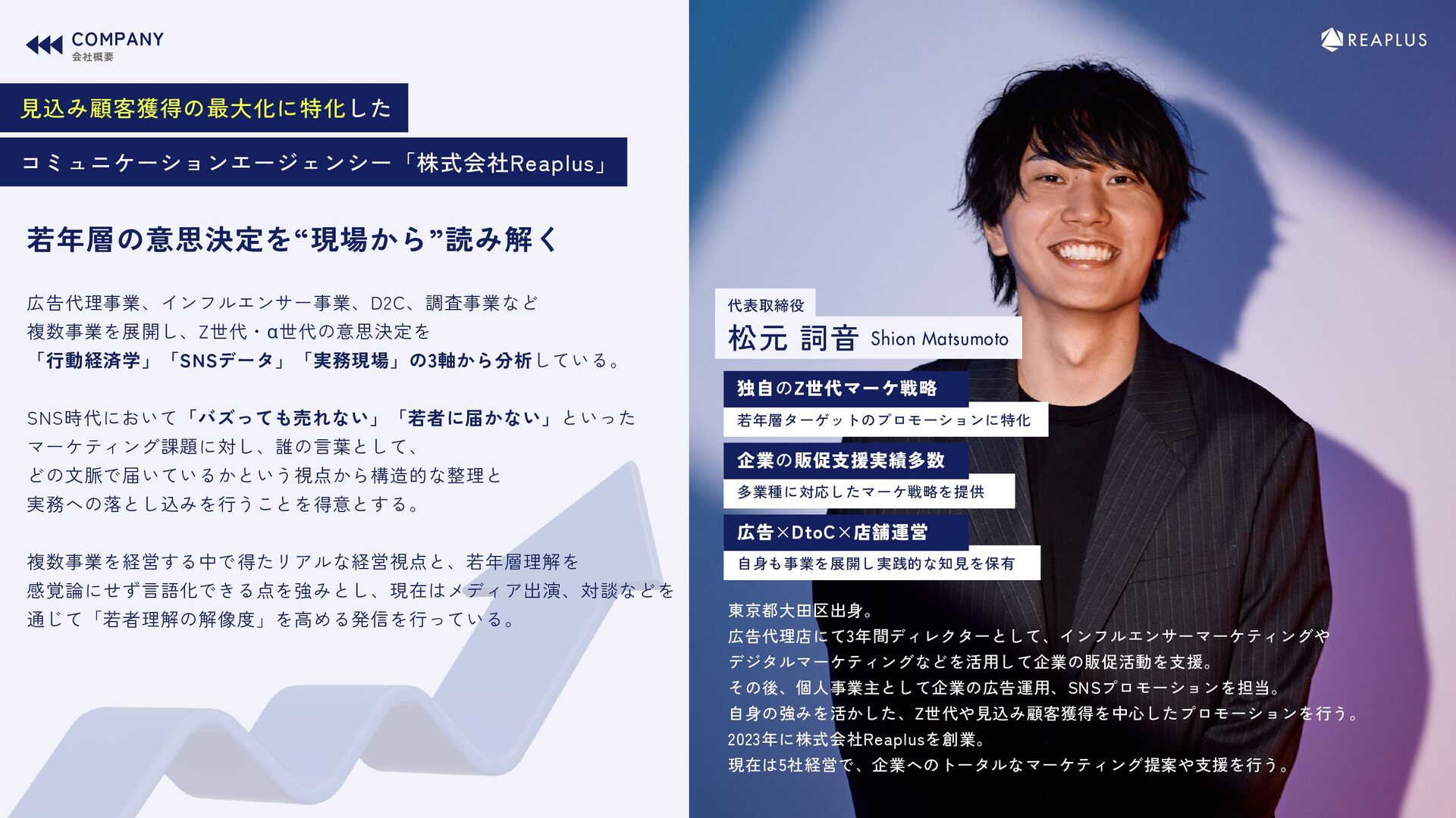 自身も事業を展開し実践的な知見を保有 東京都大田区出身。 広告代理店にて3年間ディレクターとして、インフルエンサーマーケティングや デジタルマーケティングなどを活用して企業の販促活動を支援。 その後、個人事業主として企業の広告運用、SNSプロモーションを担当。 自身の強みを活かした、Z世代や見込み顧客獲得を中心したプロモーションを行う。 2023年に株式会社Reaplusを創業。 現在は5社経営で、企業へのトータルなマーケティング提案や支援を行う。 見込み顧客獲得の最大化に特化した COMPANY 会社概要 広告代理事業、インフルエンサー事業、D2C、調査事業など 複数事業を展開し、Z世代・α世代の意思決定を 「行動経済学」「SNSデータ」「実務現場」の3軸から分析している。 SNS時代において「バズっても売れない」「若者に届かない」といった マーケティング課題に対し、誰の言葉として、 どの文脈で届いているかという視点から構造的な整理と 実務への落とし込みを行うことを得意とする。 複数事業を経営する中で得たリアルな経営視点と、若年層理解を 感覚論にせず言語化できる点を強みとし、現在はメディア出演、対談などを 通じて「若者理解の解像度」を高める発信を行っている。 若年層の意思決定を“現場から”読み解く コミュニケーションエージェンシー「株式会社Reaplus」