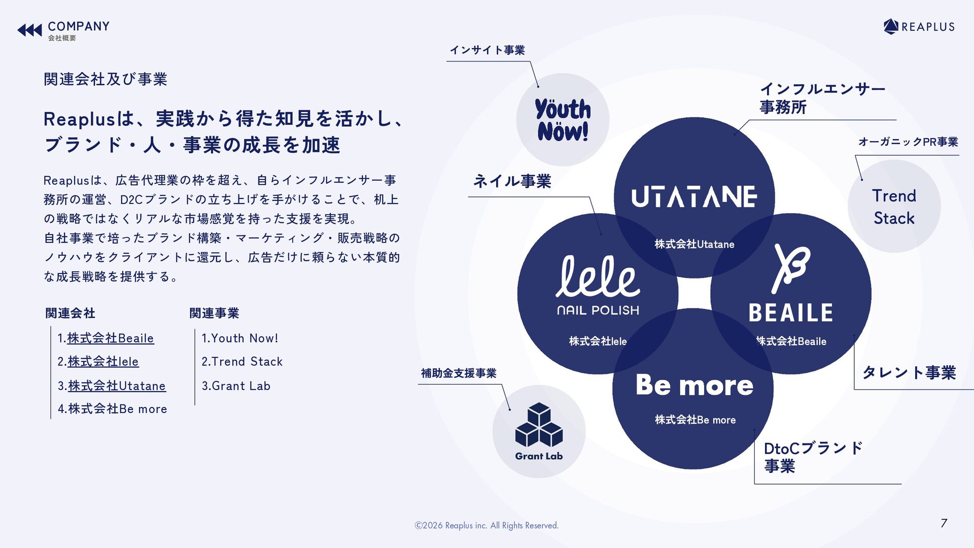 事業 株式会社Be more 関連会社及び事業 Reaplusは、広告代理業の枠を超え、自らインフルエンサー事 務所の運営、D2Cブランドの立ち上げを手がけることで、机上 の戦略ではなくリアルな市場感覚を持った支援を実現。 自社事業で培ったブランド構築・マーケティング・販売戦略の ノウハウをクライアントに還元し、広告だけに頼らない本質的 な成長戦略を提供する。 関連会社 1.株式会社Beaile 3.株式会社Utatane 2.株式会社lele 4.株式会社Be more COMPANY 会社概要 7 関連事業 1.Youth Now! 3.Grant Lab 2.Trend Stack Ⓒ2026 Reaplus inc. All Rights Reserved. Trend Stack インサイト事業 オーガニックPR事業 補助金支援事業