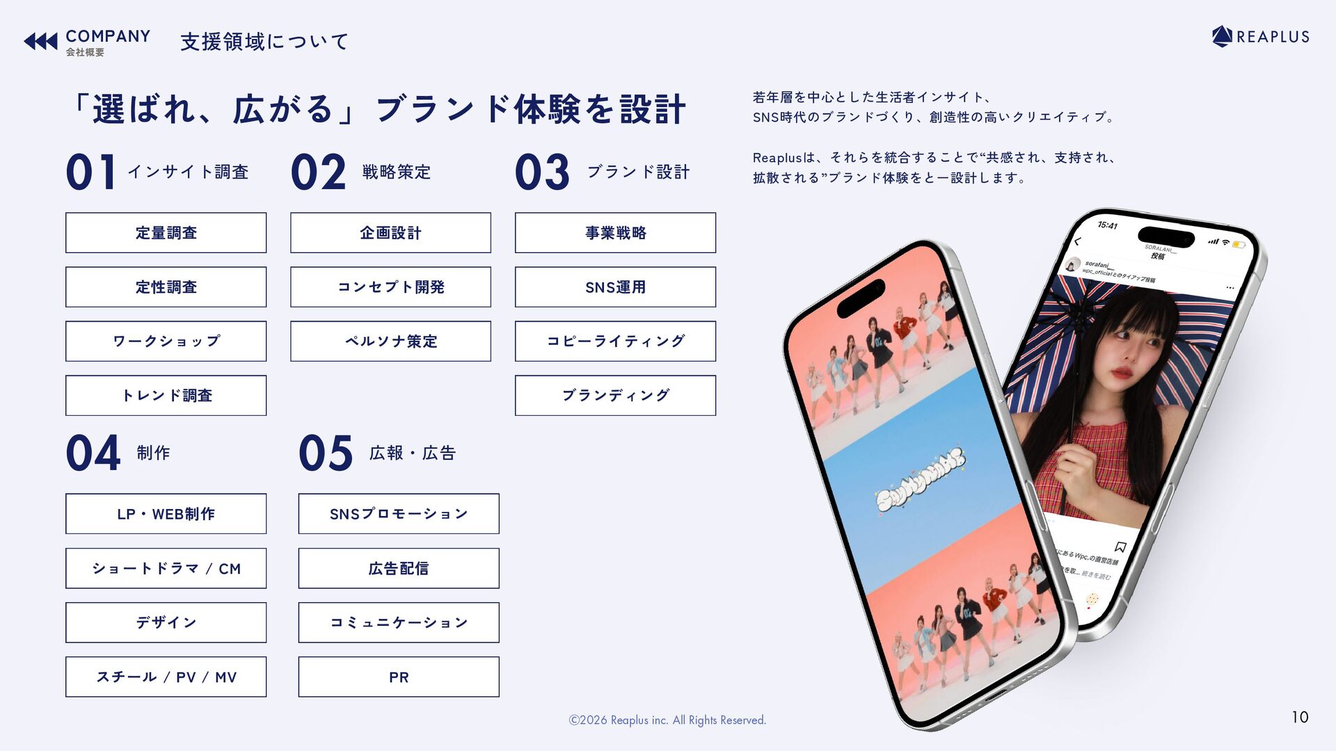 / CM デザイン スチール / PV / MV 事業戦略 SNS運用 コピーライティング ブランド設計 ブランディング 03 定量調査 定性調査 ワークショップ トレンド調査 01インサイト調査 企画設計 コンセプト開発 ペルソナ策定 02 戦略策定 「選ばれ、広がる」ブランド体験を設計 支援領域について COMPANY 会社概要 若年層を中心とした生活者インサイト、 SNS時代のブランドづくり、創造性の高いクリエイティブ。 Reaplusは、それらを統合することで“共感され、支持され、 拡散される”ブランド体験をとー設計します。 10 Ⓒ2026 Reaplus inc. All Rights Reserved.
