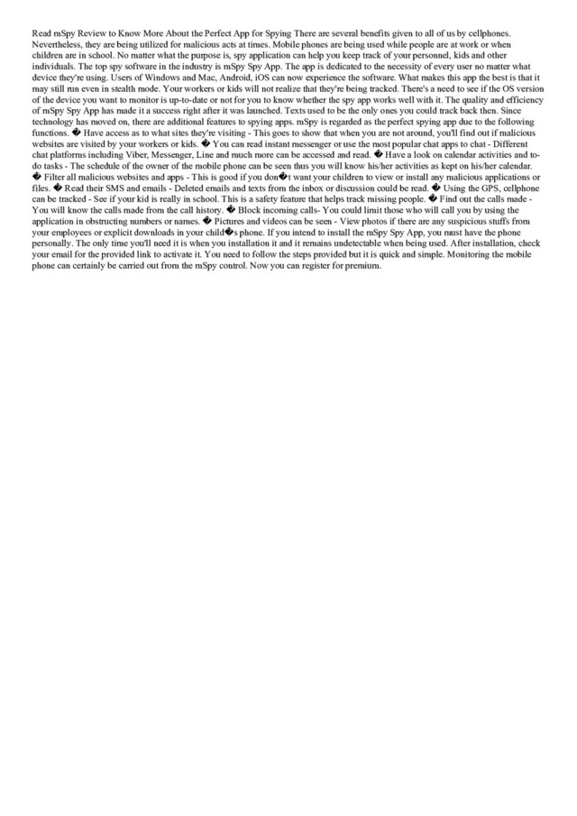 for Spying There are several benefits given to all of us by cellphones. Nevertheless, they are being utilized for malicious acts at times. Mobile phones are being used while people are at work or when children are in school. No matter what the purpose is, spy application can help you keep track of your personnel, kids and other individuals. The top spy software in the industry is mSpy Spy App. The app is dedicated to the necessity of every user no matter what device they're using. Users of Windows and Mac, Android, iOS can now experience the software. What makes this app the best is that it may still run even in stealth mode. Your workers or kids will not realize that they're being tracked. There's a need to see if the OS version of the device you want to monitor is up-to-date or not for you to know whether the spy app works well with it. The quality and efficiency of mSpy Spy App has made it a success right after it was launched. Texts used to be the only ones you could track back then. Since technology has moved on, there are additional features to spying apps. mSpy is regarded as the perfect spying app due to the following functions. � Have access as to what sites they're visiting - This goes to show that when you are not around, you'll find out if malicious websites are visited by your workers or kids. � You can read instant messenger or use the most popular chat apps to chat - Different chat platforms including Viber, Messenger, Line and much more can be accessed and read. � Have a look on calendar activities and to- do tasks - The schedule of the owner of the mobile phone can be seen thus you will know his/her activities as kept on his/her calendar. � Filter all malicious websites and apps - This is good if you don�t want your children to view or install any malicious applications or files. � Read their SMS and emails - Deleted emails and texts from the inbox or discussion could be read. � Using the GPS, cellphone can be tracked - See if your kid is really in school. This is a safety feature that helps track missing people. � Find out the calls made - You will know the calls made from the call history. � Block incoming calls- You could limit those who will call you by using the application in obstructing numbers or names. � Pictures and videos can be seen - View photos if there are any suspicious stuffs from your employees or explicit downloads in your child�s phone. If you intend to install the mSpy Spy App, you must have the phone personally. The only time you'll need it is when you installation it and it remains undetectable when being used. After installation, check your email for the provided link to activate it. You need to follow the steps provided but it is quick and simple. Monitoring the mobile phone can certainly be carried out from the mSpy control. Now you can register for premium.