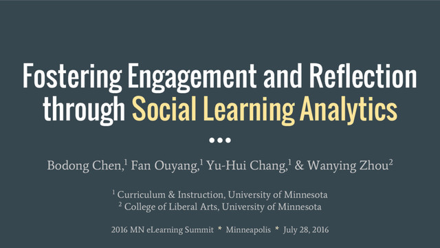 Curriculum & Instruction, University of Minnesota 2 College of Liberal Arts, University of Minnesota 2016 MN eLearning Summit * Minneapolis * July 28, 2016 Fostering Engagement and Reflection through Social Learning Analytics
