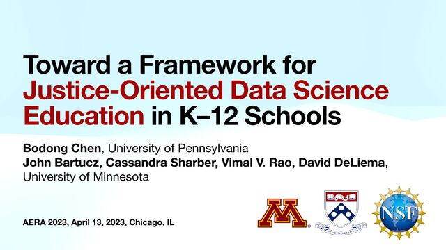 engage in data science in culturally congruent manners. 5. Identity and cultural practices • Culturally responsive teaching (Hammond, 2014; Ladson-Billings, 2021) • Democratic participation, self identity, family history (Kahn, 2020; Philip et al., 2013, p. 2013; Wilkerson & Polman, 2020) • Hybrid language practices (Gutiérrez et al., 1999) • Arts and data (Bhargava et al., 2016) Justice-oriented data science (JODS)