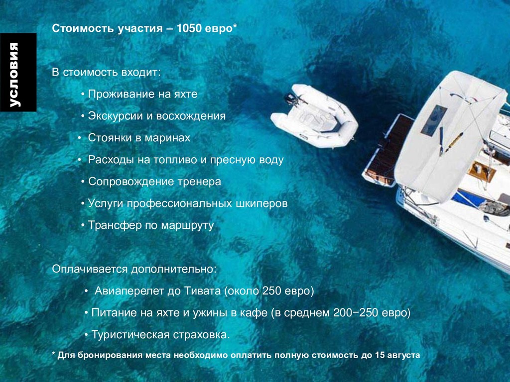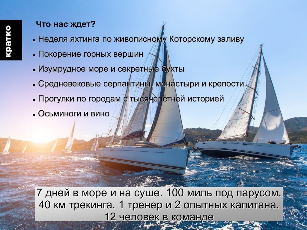 Нас ждет неделя яхтинга в красивейшем Которском заливе. Плюс пешие прогулки в горах. В промежутках между морскими переходами мы пройдем десятки километров по старинным тропам времен Австро-Венгрии и покорим вершину Ориен. Специальная подготовка не требуется!