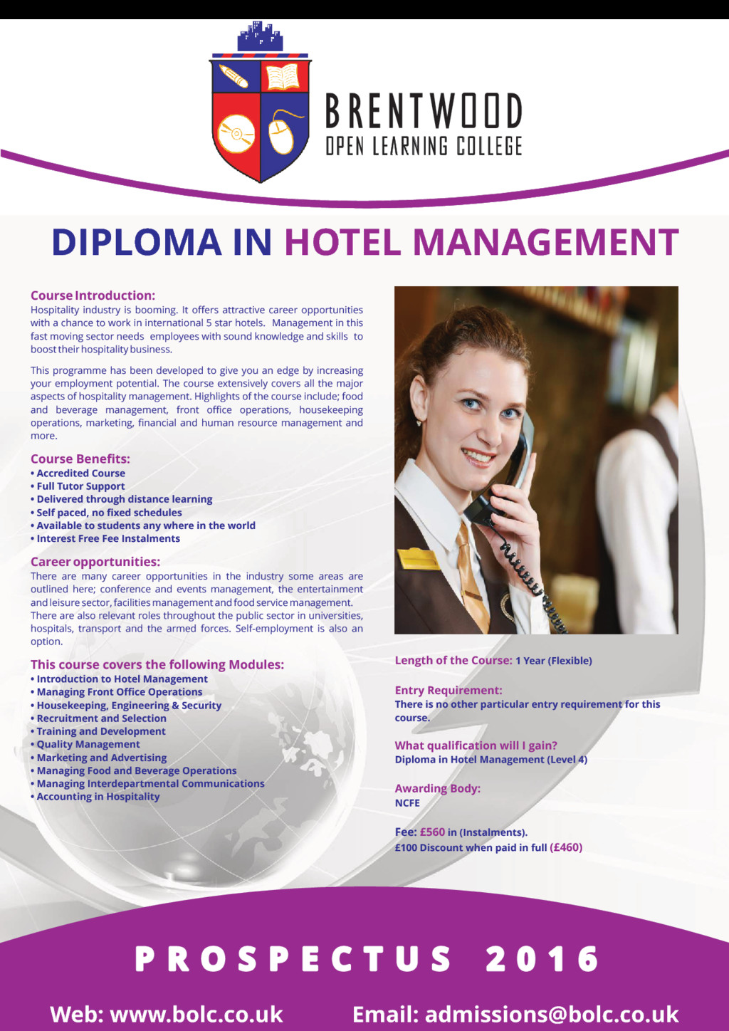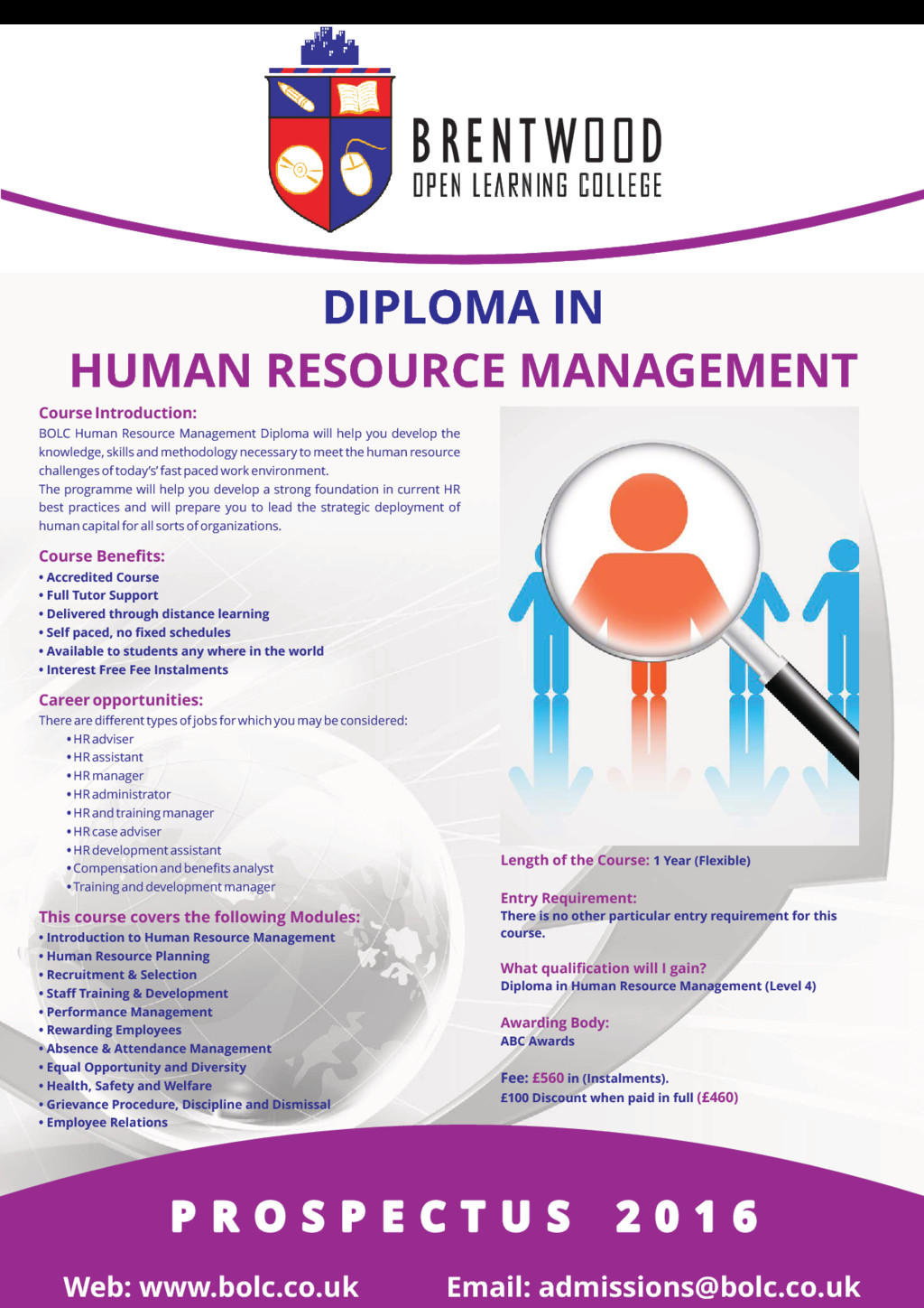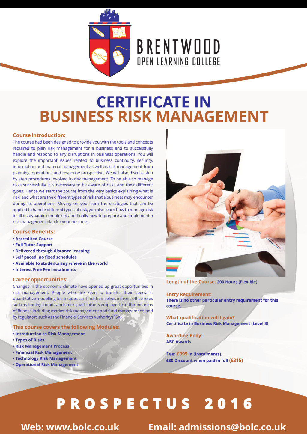 Project management is about the application of methods, knowledge, skills and processes to achieve the project objectives. Appropriate project management skills assure the successful completion of the project. This course explains what the project management is all about and how to approach it successfully. The course is suitable for you whether you are in any industry; oil and gas, renewable energy, engineering, built environment, information technology, construction, knowledge management, marketing, public sector, pharmaceutical, health care, military, education, entertainment and creative industries. Effective project management leads you to; • a greater possibility of achieving the required results; • satisfies the differing interests of the stakeholders of the project; • ensures the proficient and effective use of available resources Course Benefits: • Accredited Course • Full Tutor Support • Delivered through distance learning • Self paced, no fixed schedules • Available to students any where in the world • Interest Free Fee Instalments Career opportunities: You could work as a project manager in most industries, including construction, IT, marketing, manufacturing, Aerospace and Defense, information Technology, automation, Systems Manufacturing, Education and training, financial services and the public sector. This course covers the following Modules: • Introduction To Project Management • Planning A Project • Project Scope Management • Project Time Management • Managing Project Quality And Risk • Managing Communication on a Project • Managing Project Globally Length of the Course: 200 Hours (Flexible) Entry Requirement: There is no other particular entry requirement for this course. What qualification will I gain? Certificate in Project Management (Level 3) Awarding Body: ABC Awards Fee: in (Instalments). £395 £75 Discount when paid in full (£315) P R O S P E C T U S 2 0 1 6 P R O S P E C T U S 2 0 1 6 P R O S P E C T U S 2 0 1 6