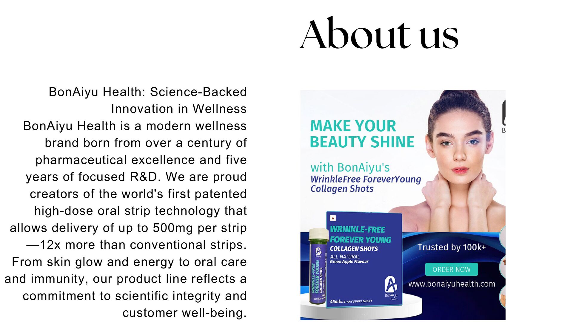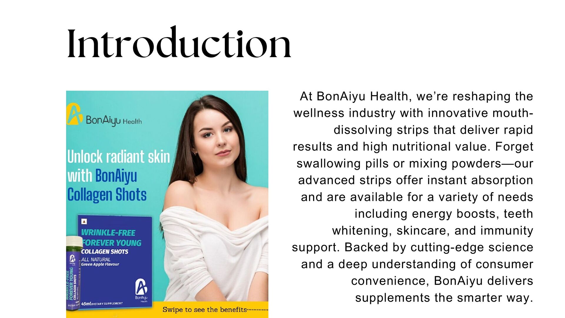 BonAiyu’s marine collagen shots support skin elasticity, hydration, and anti-aging. With every shot, your skin gets the nutrients it needs to stay firm and radiant. Ideal for reducing fine lines and signs of aging, these shots are your daily skin-care partner. Fast-absorbing and travel-friendly for daily use. Try our collagen shots for youthful skin and glow naturally.