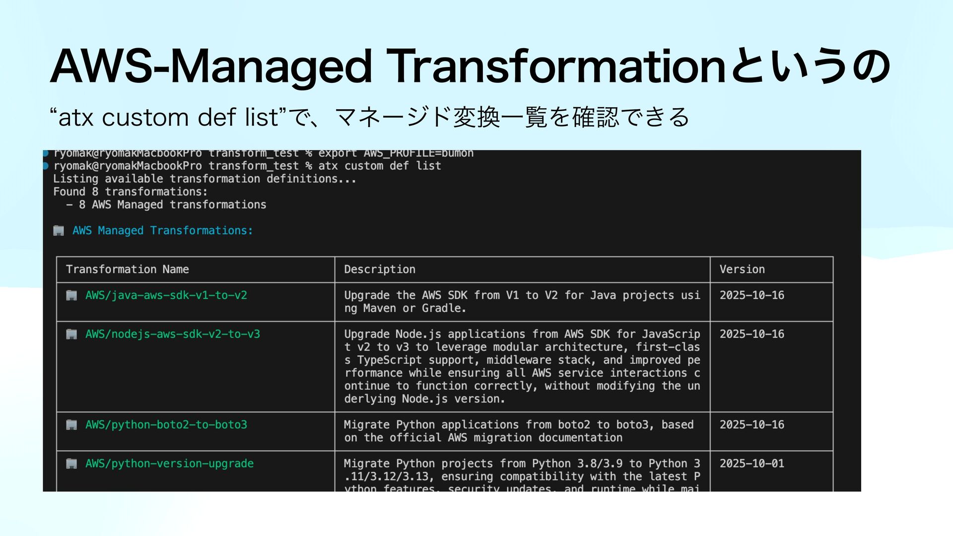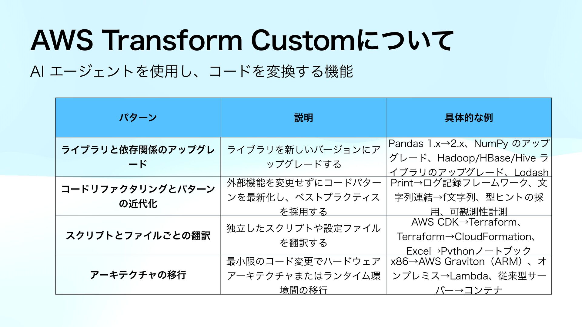 άϨʔυɺ)BEPPQ)#BTF)JWFϥ ΠϒϥϦͷΞοϓάϨʔυɺ-PEBTI ίʔυϦϑΝΫλϦϯάͱύλʔϯ ͷۙԽ ֎෦ػೳΛมߋͤͣʹίʔυύλʔ ϯΛ࠷৽Խ͠ɺϕετϓϥΫςΟε Λ࠾༻͢Δ 1SJOUˠϩάهϑϨʔϜϫʔΫɺจ ࣈྻ࿈݁ˠGจࣈྻɺܕώϯτͷ࠾ ༻ɺՄ؍ଌੑܭଌ εΫϦϓτͱϑΝΠϧ͝ͱͷ༁ ಠཱͨ͠εΫϦϓτઃఆϑΝΠϧ Λ༁͢Δ "84$%,ˠ5FSSBGPSNɺ 5FSSBGPSNˠ$MPVE'PSNBUJPOɺ &YDFMˠ1ZUIPOϊʔτϒοΫ ΞʔΩςΫνϟͷҠߦ ࠷খݶͷίʔυมߋͰϋʔυΣΞ ΞʔΩςΫνϟ·ͨϥϯλΠϜ ڥؒͷҠߦ Yˠ"84(SBWJUPOʢ"3.ʣɺΦ ϯϓϨϛεˠ-BNCEBɺैདྷܕαʔ όʔˠίϯςφ