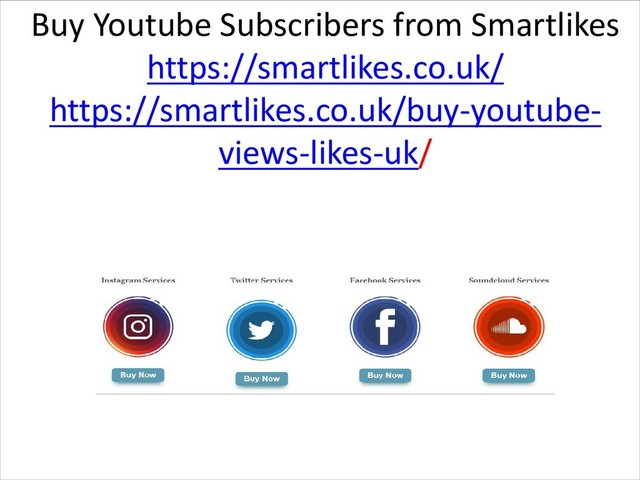can buy youtube subscribers, views and like from us. Smartlikes will provide best services, refill guaranteed . https://smartlikes.co.uk/ https://smartlikes.co.uk/buy-youtube-views-likes-uk/ https://smartlikes.co.uk/buy-instagram-followers/