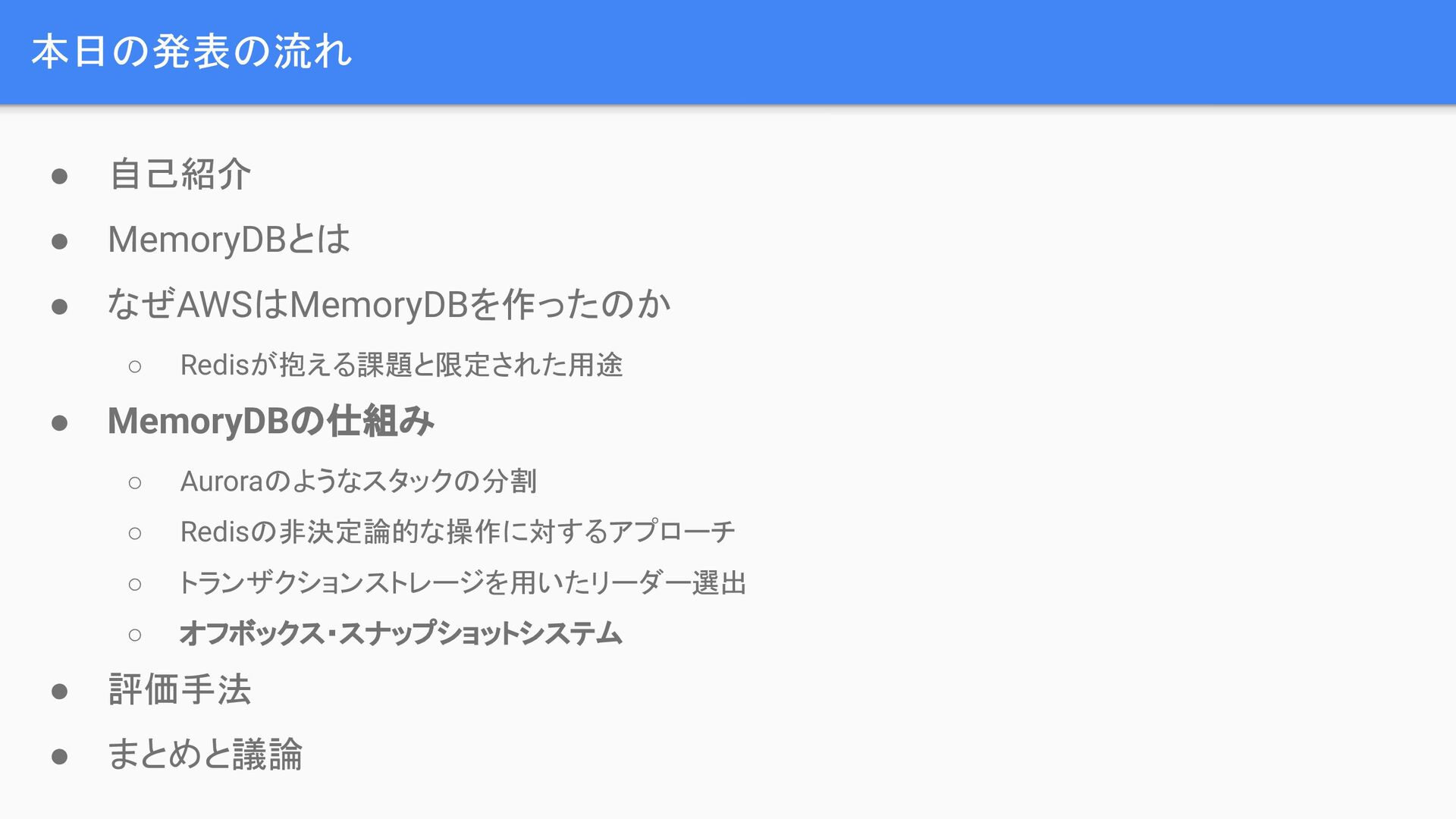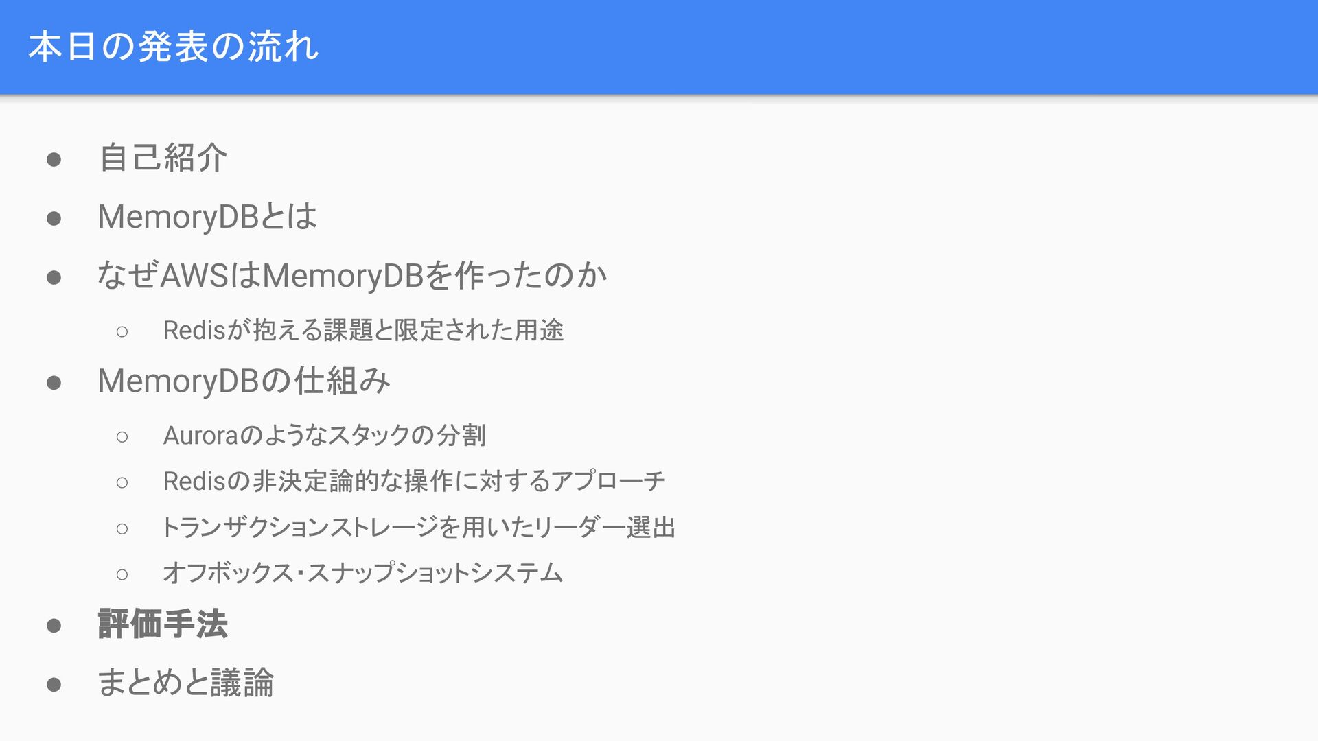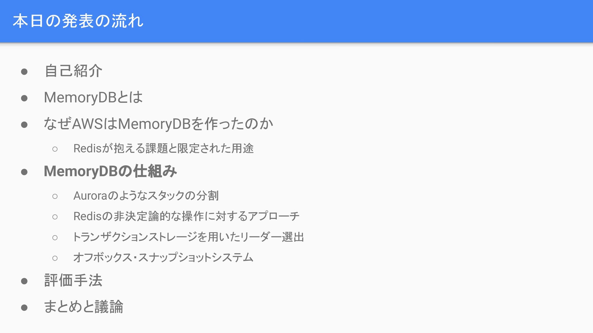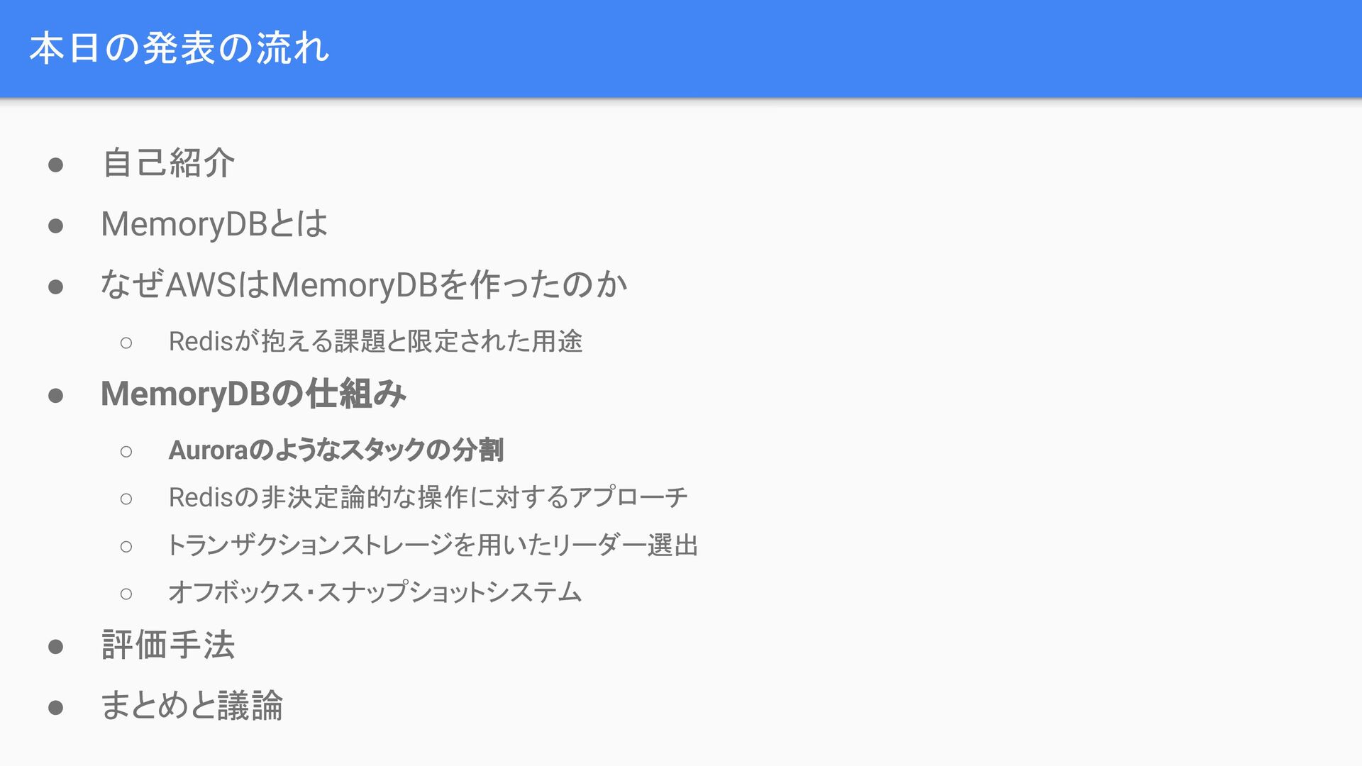 MemoryDBの仕組み ◦ Auroraのようなスタックの分割 ◦ Redisの非決定論的な操作に対するアプローチ ◦ トランザクションストレージを用いたリーダー選出 ◦ オフボックス・スナップショットシステム • 評価手法 • まとめと議論