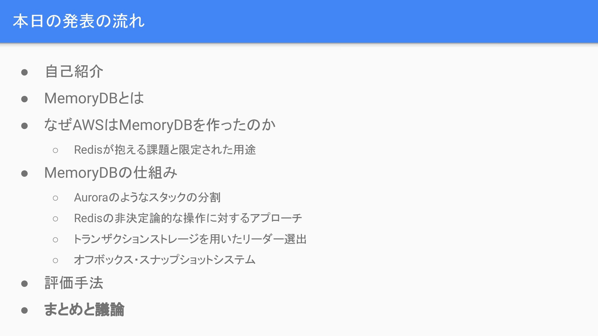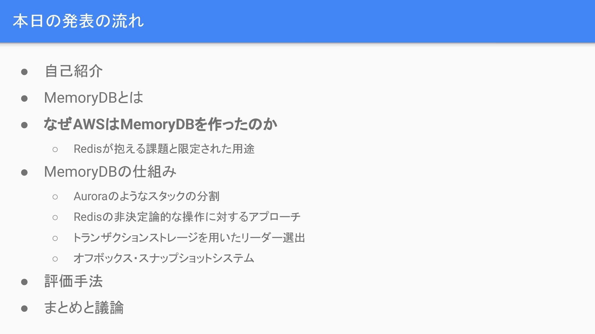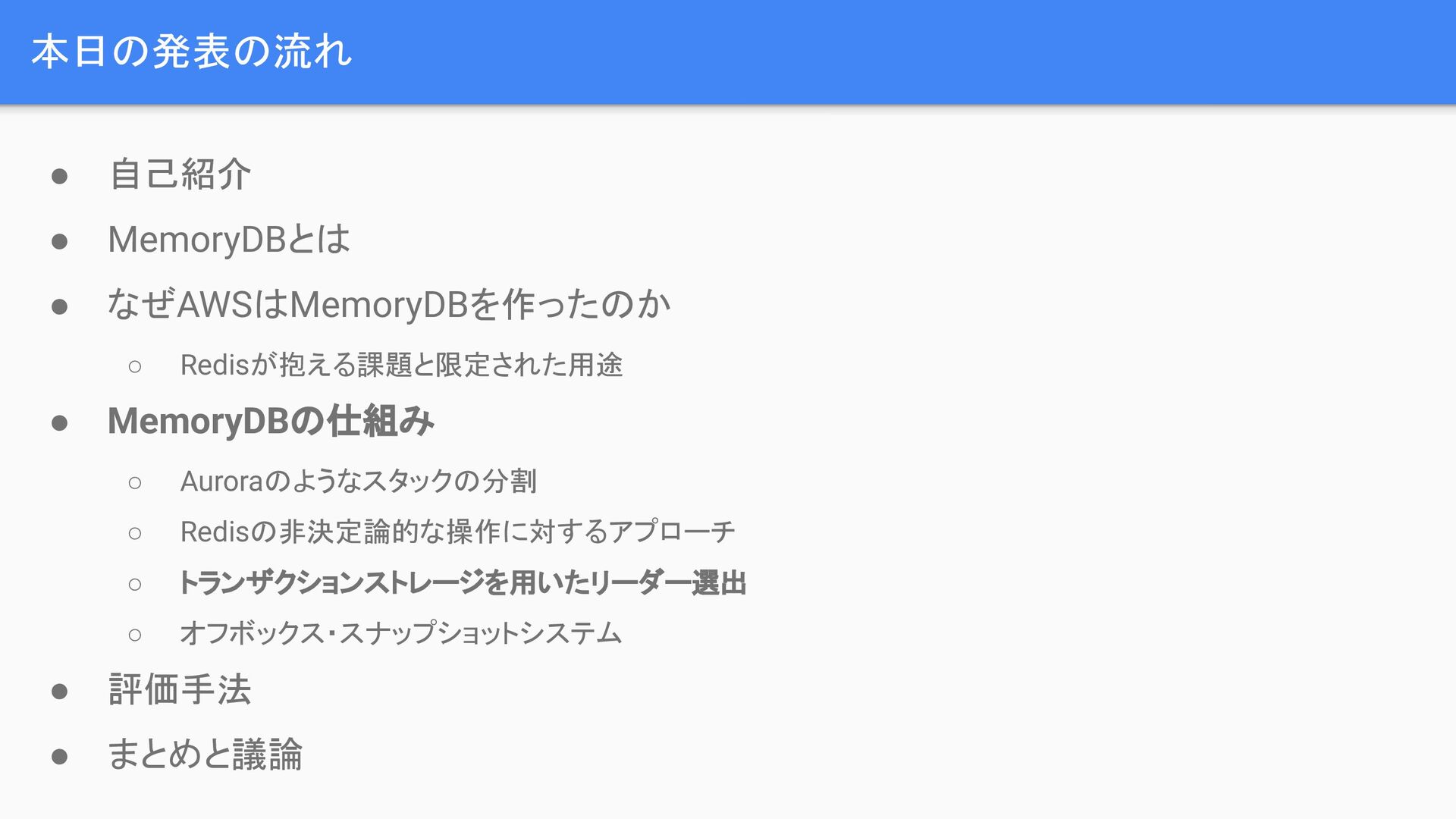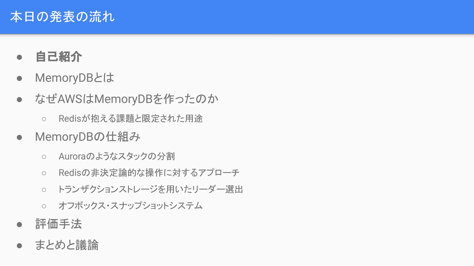 MemoryDBの仕組み ◦ Auroraのようなスタックの分割 ◦ Redisの非決定論的な操作に対するアプローチ ◦ トランザクションストレージを用いたリーダー選出 ◦ オフボックス・スナップショットシステム • 評価手法 • まとめと議論