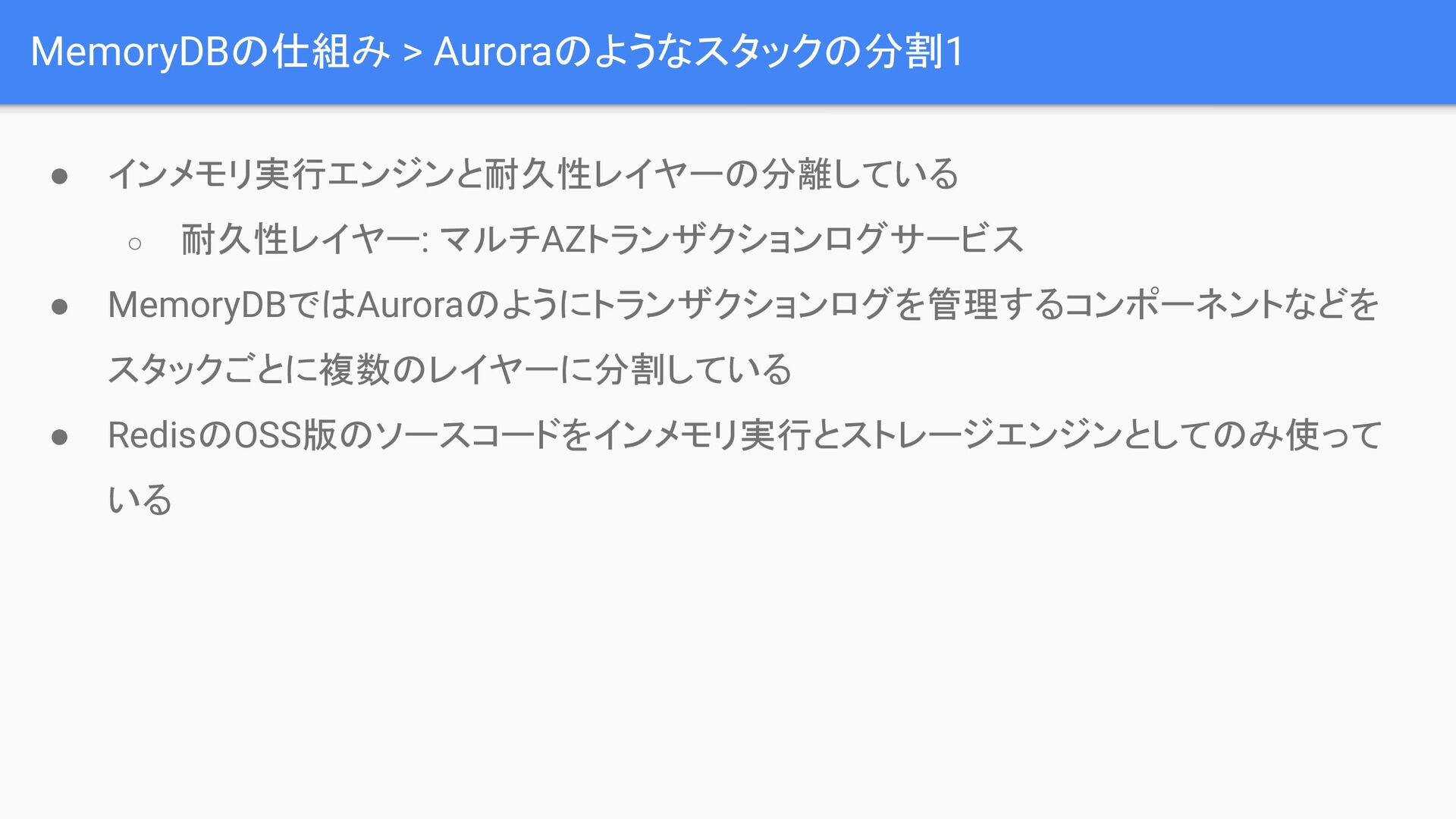 MemoryDBの仕組み > Auroraのようなスタックの分割1 • インメモリ実行エンジンと耐久性レイヤーの分離している ◦ 耐久性レイヤー: マルチAZトランザクションログサービス • MemoryDBではAuroraのようにトランザクションログを管理するコンポーネントなどを
