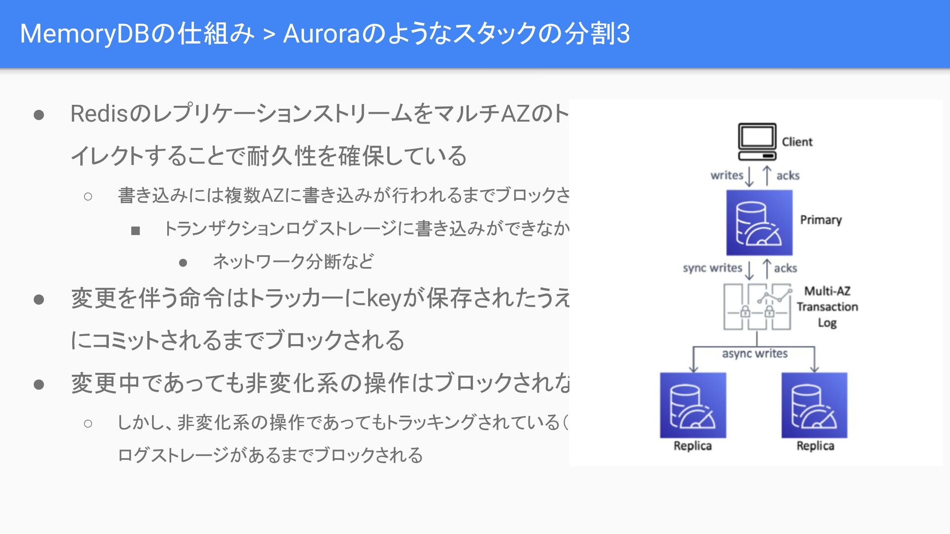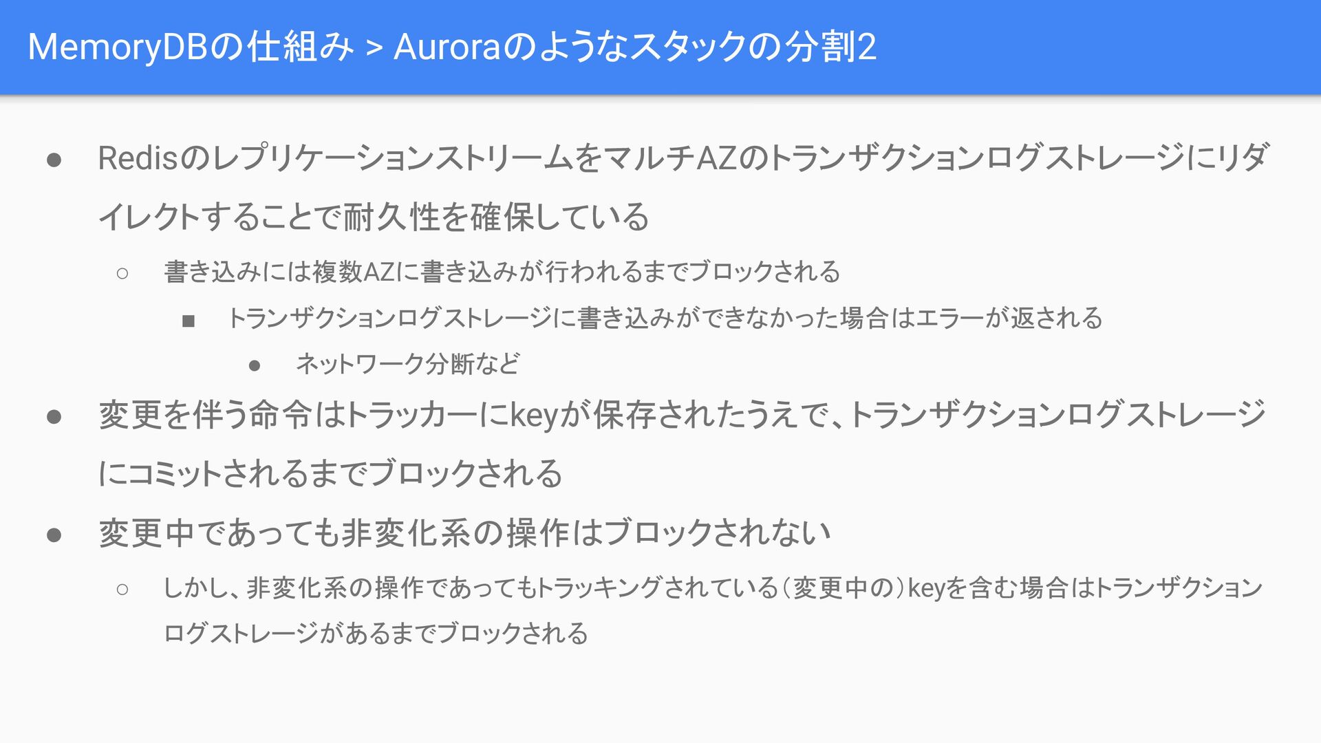 MemoryDBの仕組み > Auroraのようなスタックの分割2 • RedisのレプリケーションストリームをマルチAZのトランザクションログストレージにリダ イレクトすることで耐久性を確保している ◦ 書き込みには複数AZに書き込みが行われるまでブロックされる ▪ トランザクションログストレージに書き込みができなかった場合はエラーが返される
