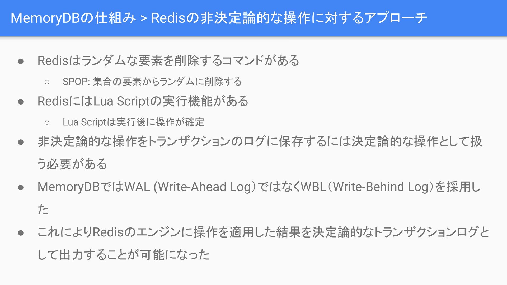 Scriptの実行機能がある ◦ Lua Scriptは実行後に操作が確定 • 非決定論的な操作をトランザクションのログに保存するには決定論的な操作として扱 う必要がある • MemoryDBではWAL (Write-Ahead Log)ではなくWBL(Write-Behind Log)を採用し た • これによりRedisのエンジンに操作を適用した結果を決定論的なトランザクションログと して出力することが可能になった