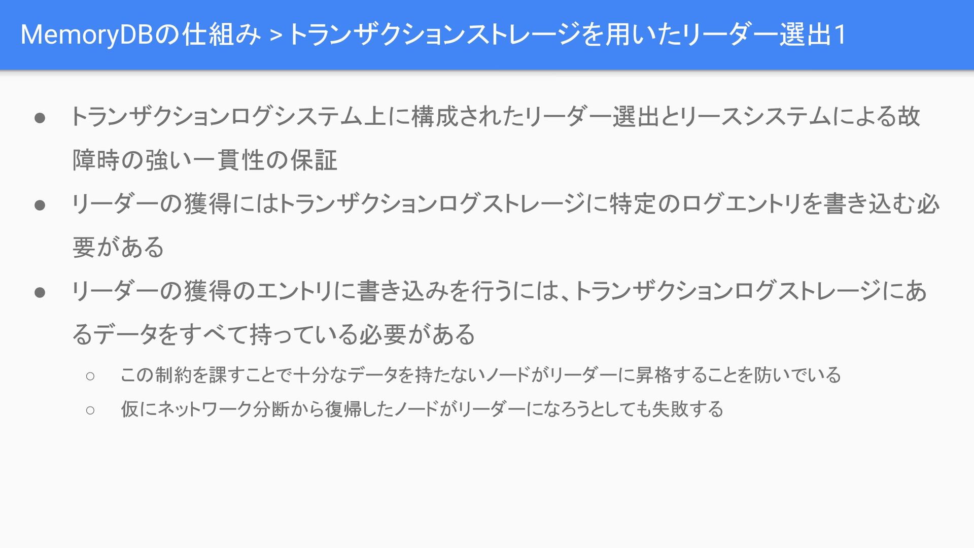 MemoryDBの仕組み > トランザクションストレージを用いたリーダー選出1 • トランザクションログシステム上に構成されたリーダー選出とリースシステムによる故 障時の強い一貫性の保証 • リーダーの獲得にはトランザクションログストレージに特定のログエントリを書き込む必 要がある •