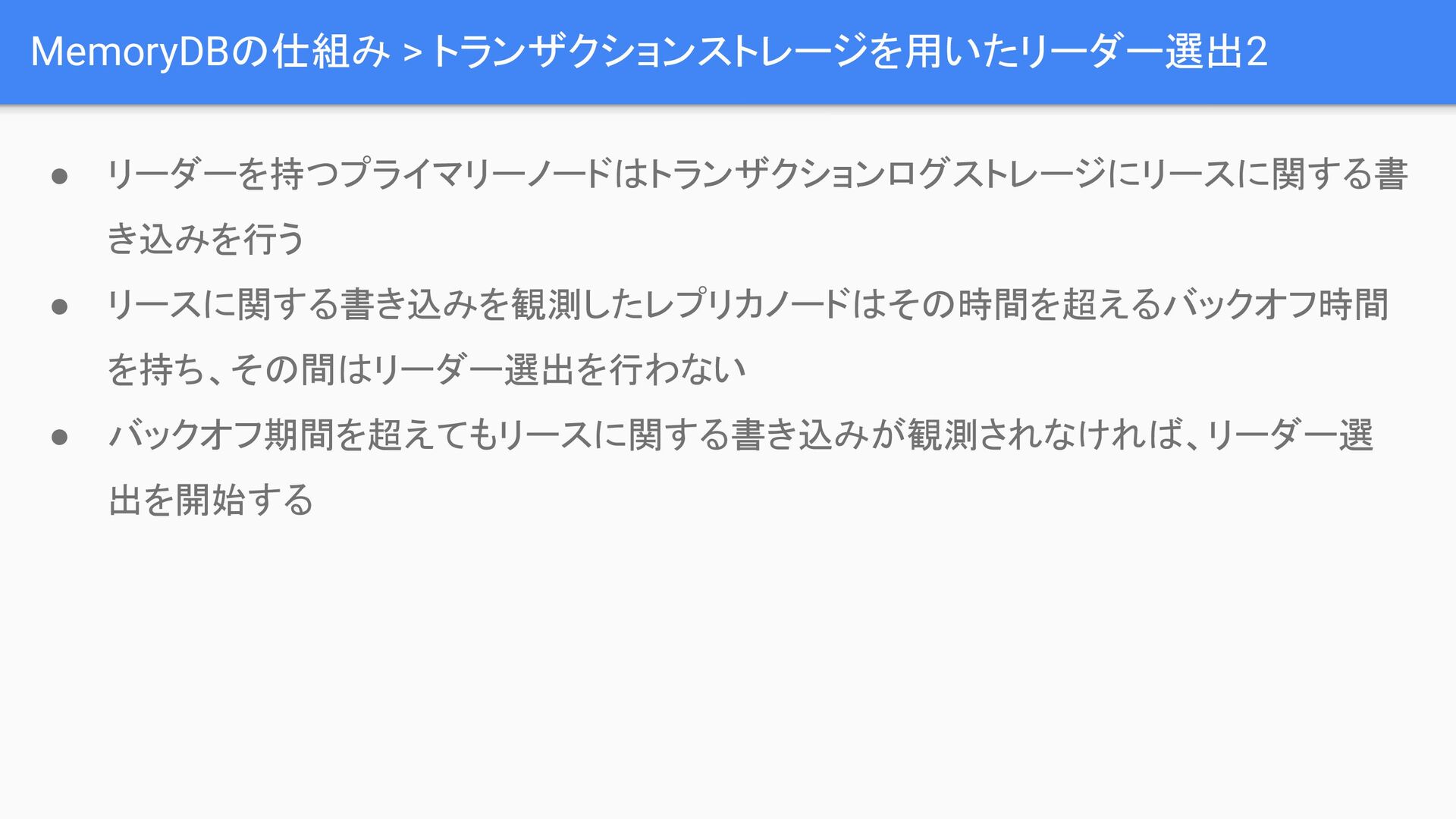 MemoryDBの仕組み > トランザクションストレージを用いたリーダー選出2 • リーダーを持つプライマリーノードはトランザクションログストレージにリースに関する書 き込みを行う • リースに関する書き込みを観測したレプリカノードはその時間を超えるバックオフ時間 を持ち、その間はリーダー選出を行わない •