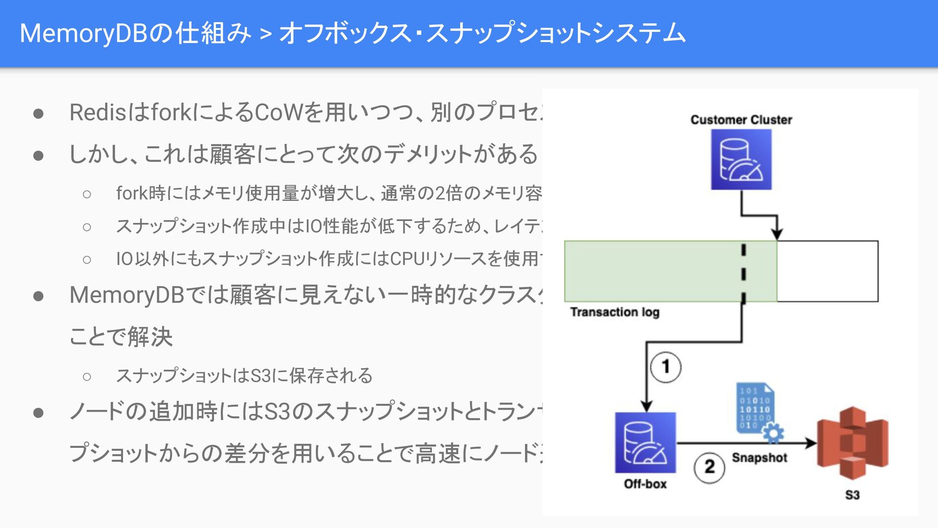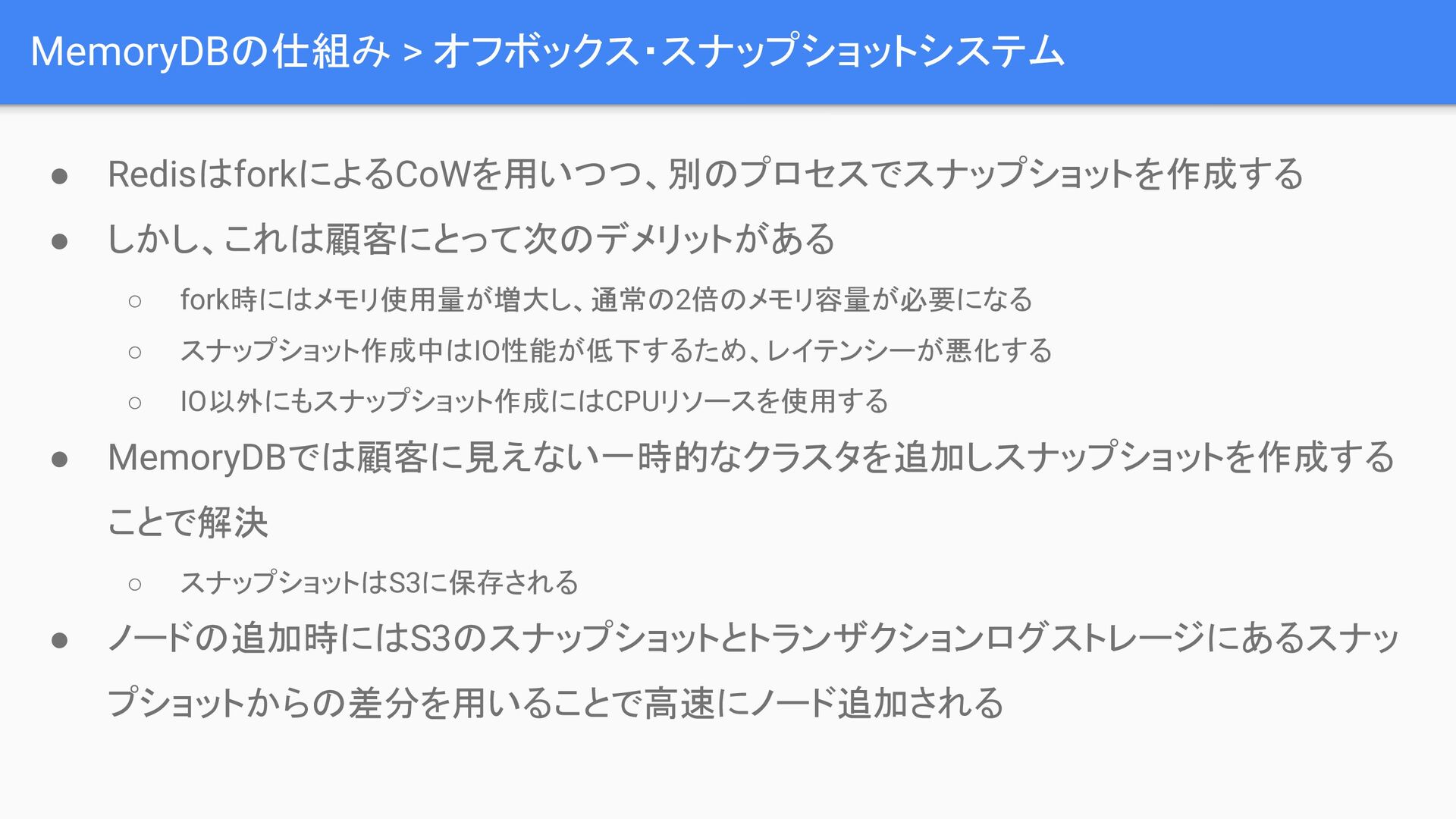 スナップショット作成中はIO性能が低下するため、レイテンシーが悪化する ◦ IO以外にもスナップショット作成にはCPUリソースを使用する • MemoryDBでは顧客に見えない一時的なクラスタを追加しスナップショットを作成する ことで解決 ◦ スナップショットはS3に保存される • ノードの追加時にはS3のスナップショットとトランザクションログストレージにあるスナッ プショットからの差分を用いることで高速にノード追加される