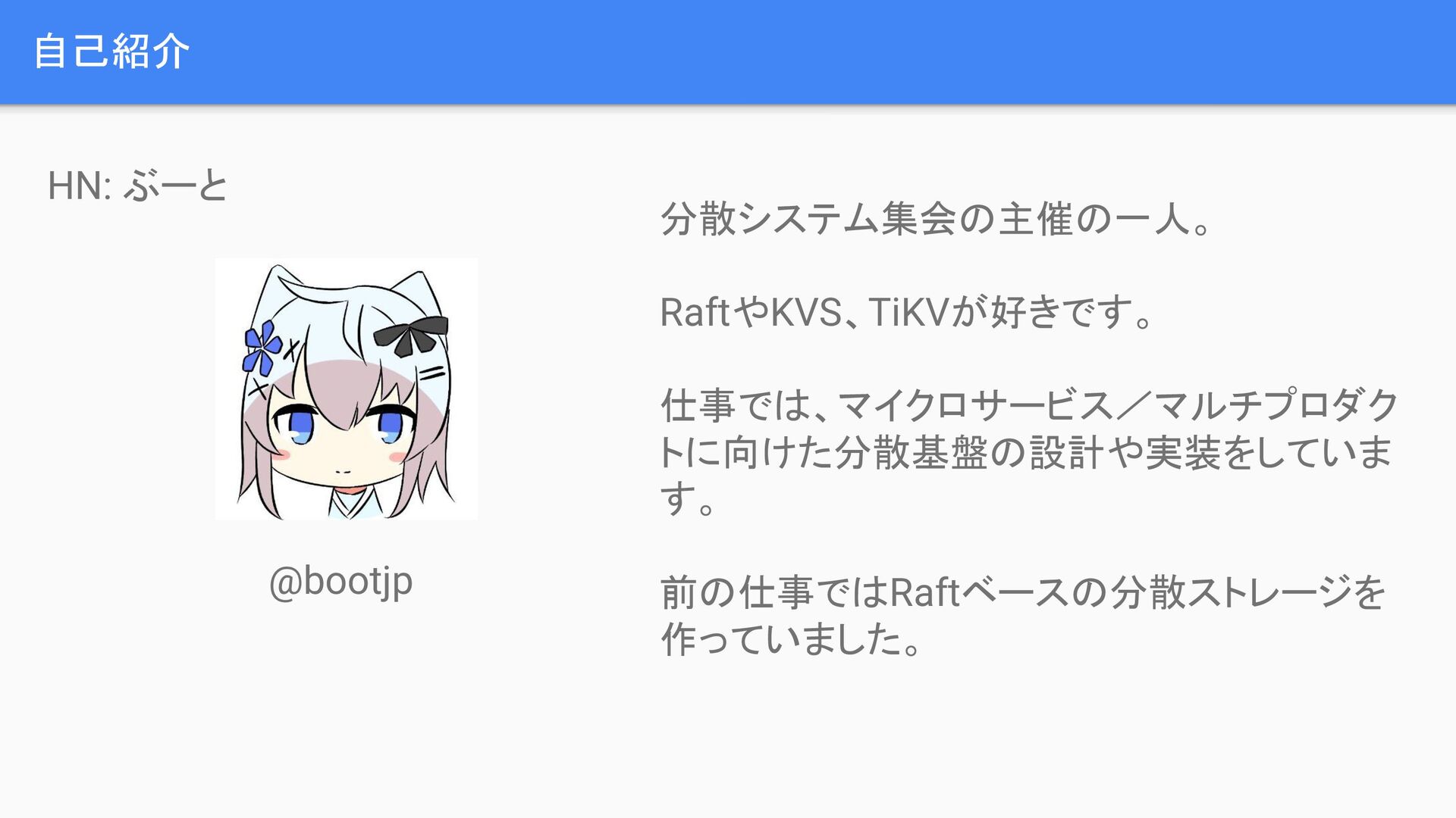 自己紹介 HN: ぶーと 分散システム集会の主催の一人。 RaftやKVS、TiKVが好きです。 仕事では、マイクロサービス/マルチプロダク トに向けた分散基盤の設計や実装をしていま す。 前の仕事ではRaftベースの分散ストレージを 作っていました。