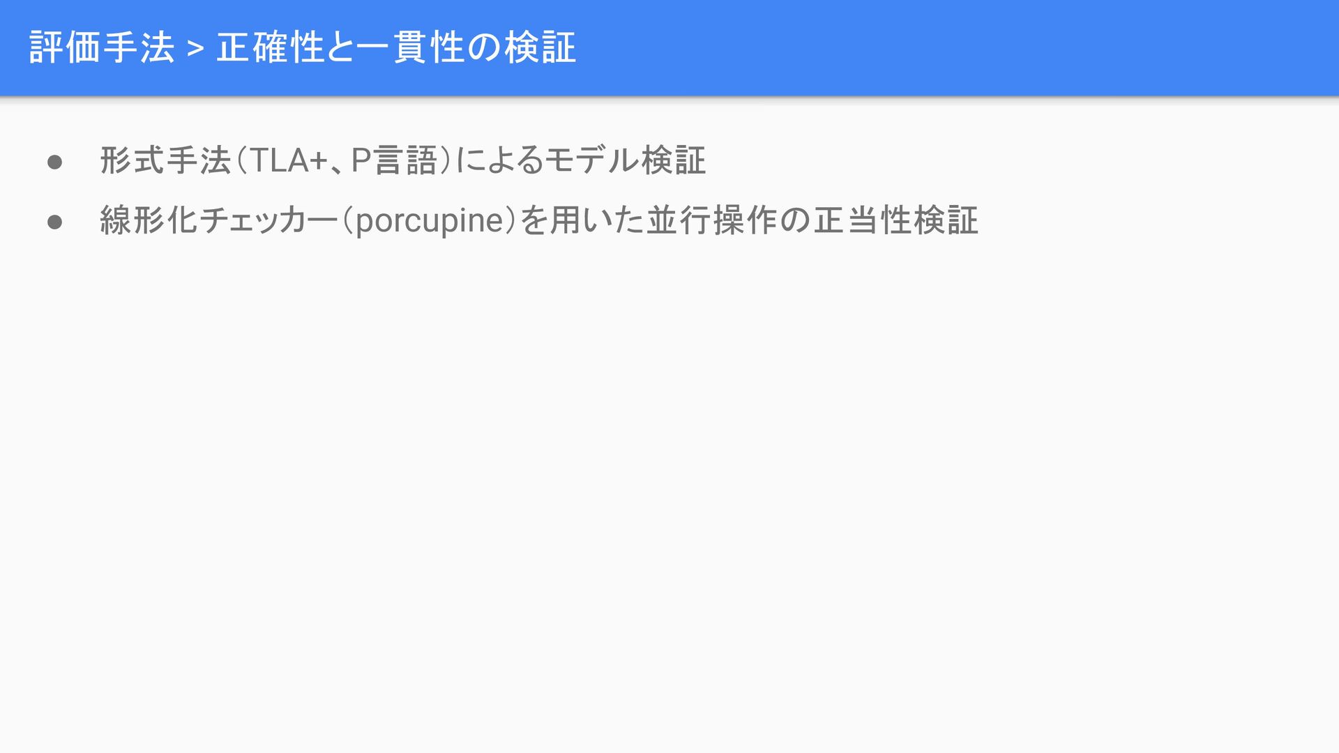 評価手法 > 正確性と一貫性の検証 • 形式手法(TLA+、P言語)によるモデル検証 • 線形化チェッカー(porcupine)を用いた並行操作の正当性検証