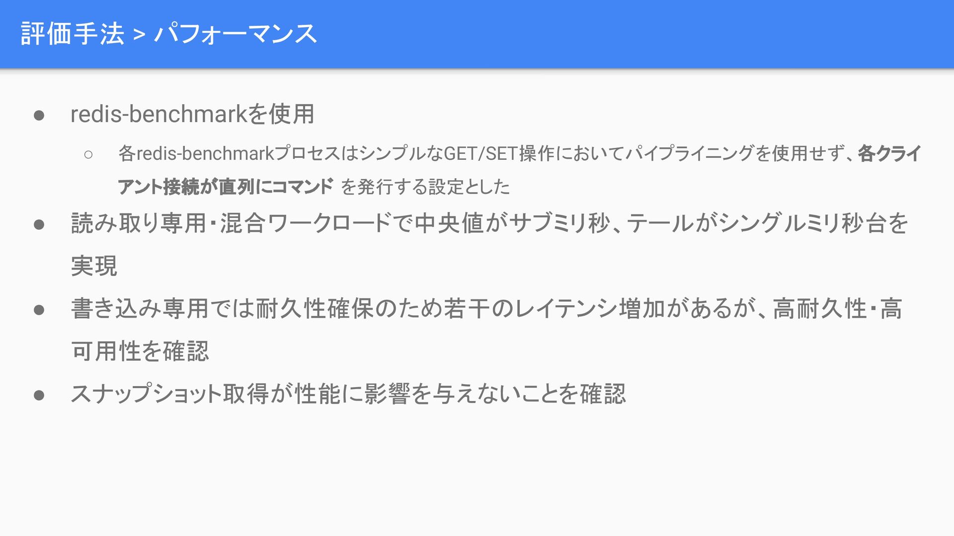 評価手法 > パフォーマンス • redis-benchmarkを使用 ◦ 各redis‑benchmarkプロセスはシンプルなGET/SET操作においてパイプライニングを使用せず、各クライ アント接続が直列にコマンド を発行する設定とした •