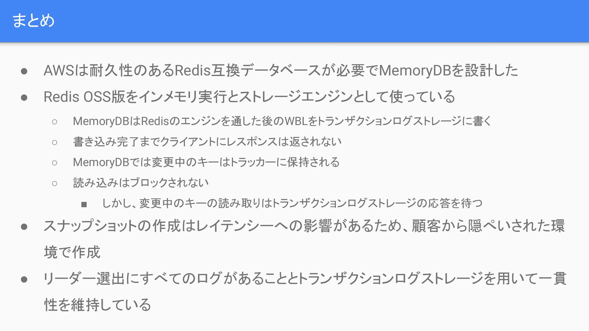 まとめ • AWSは耐久性のあるRedis互換データベースが必要でMemoryDBを設計した • Redis OSS版をインメモリ実行とストレージエンジンとして使っている ◦ MemoryDBはRedisのエンジンを通した後のWBLをトランザクションログストレージに書く ◦ 書き込み完了までクライアントにレスポンスは返されない