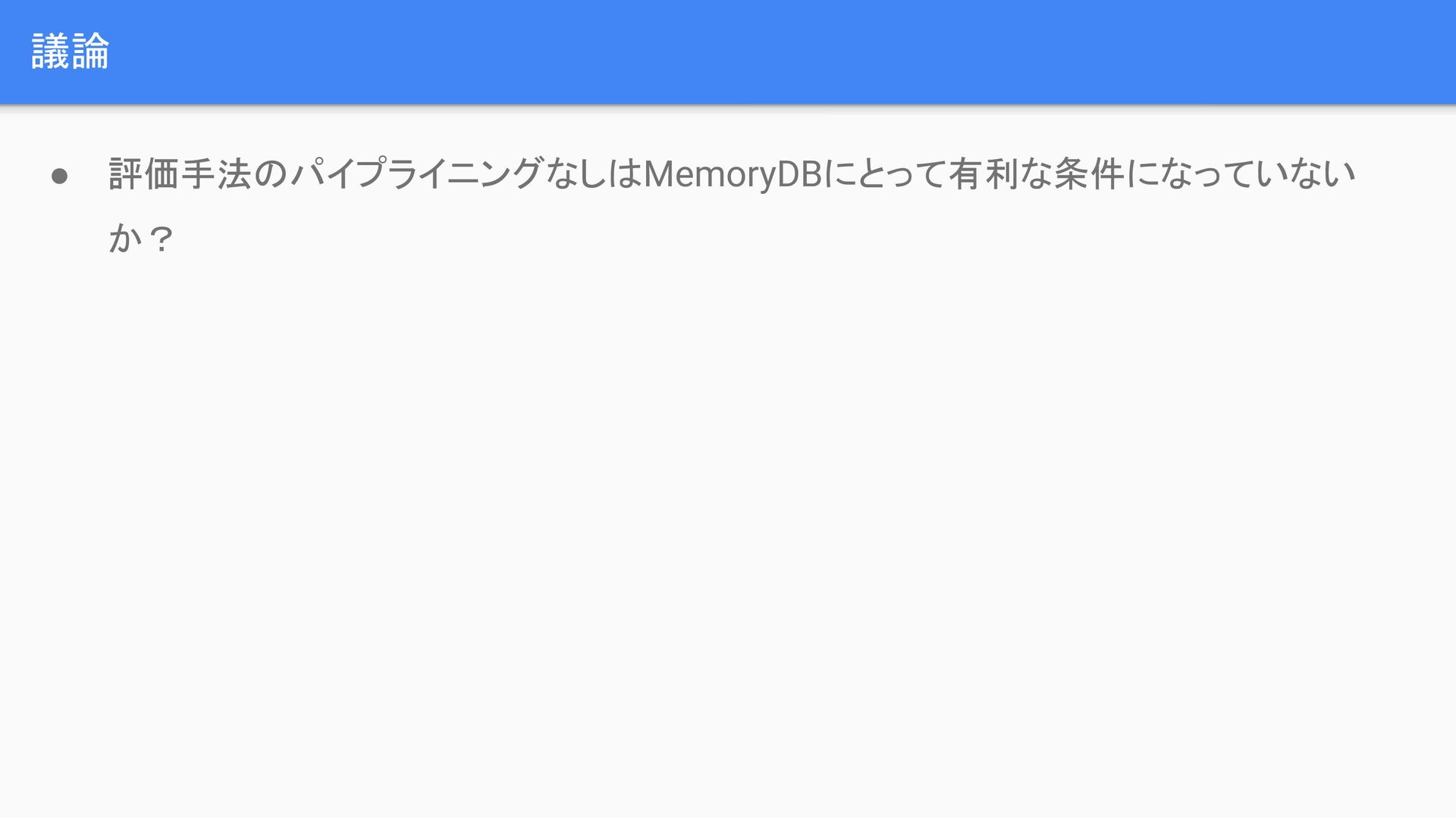 議論 • 評価手法のパイプライニングなしはMemoryDBにとって有利な条件になっていない か?