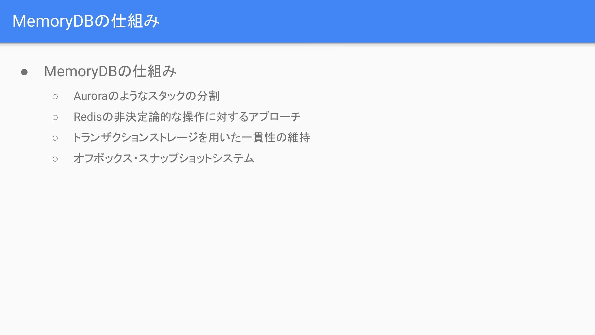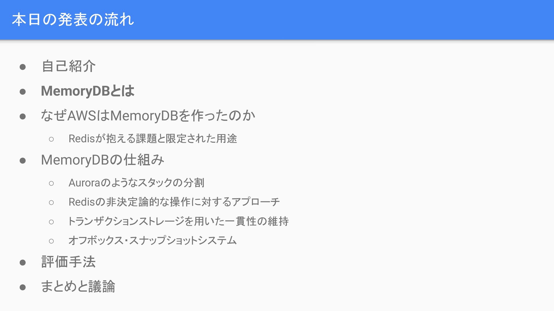 MemoryDBの仕組み ◦ Auroraのようなスタックの分割 ◦ Redisの非決定論的な操作に対するアプローチ ◦ トランザクションストレージを用いた一貫性の維持 ◦ オフボックス・スナップショットシステム • 評価手法 • まとめと議論