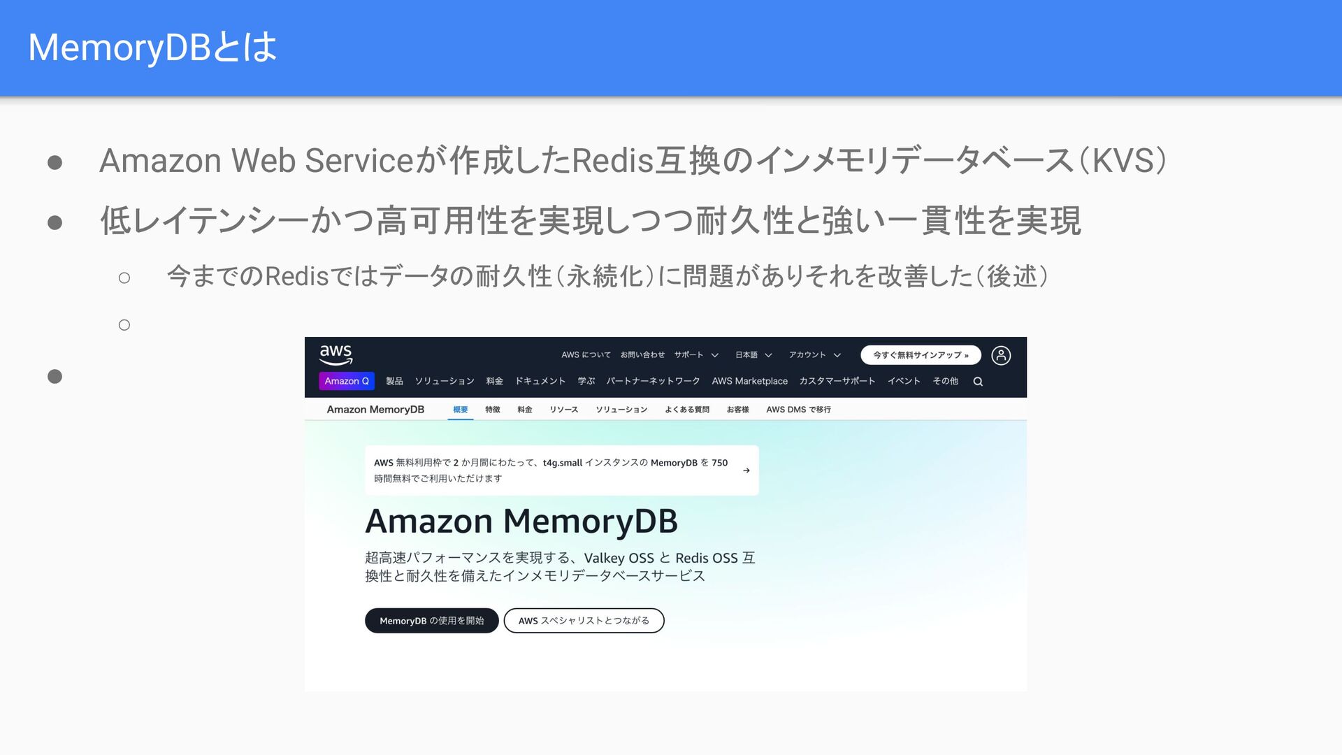 MemoryDBとは • Amazon Web Serviceが作成したRedis互換のインメモリデータベース(KVS) • 低レイテンシーかつ高可用性を実現しつつ耐久性と強い一貫性を実現 ◦ 今までのRedisではデータの耐久性(永続化)に問題がありそれを改善した(後述) ◦