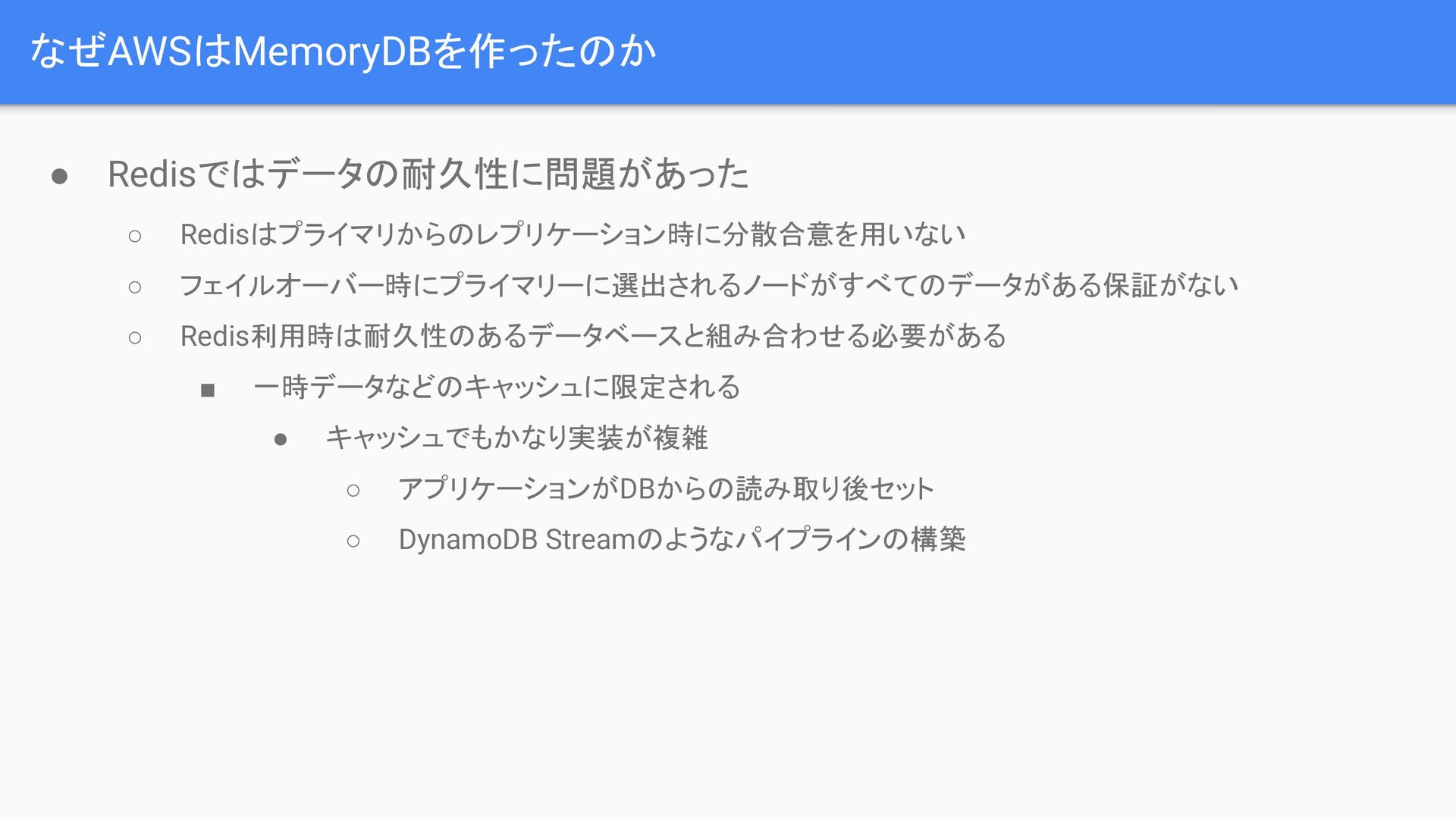 なぜAWSはMemoryDBを作ったのか • Redisではデータの耐久性に問題があった ◦ Redisはプライマリからのレプリケーション時に分散合意を用いない ◦ フェイルオーバー時にプライマリーに選出されるノードがすべてのデータがある保証がない ◦ Redis利用時は耐久性のあるデータベースと組み合わせる必要がある ▪