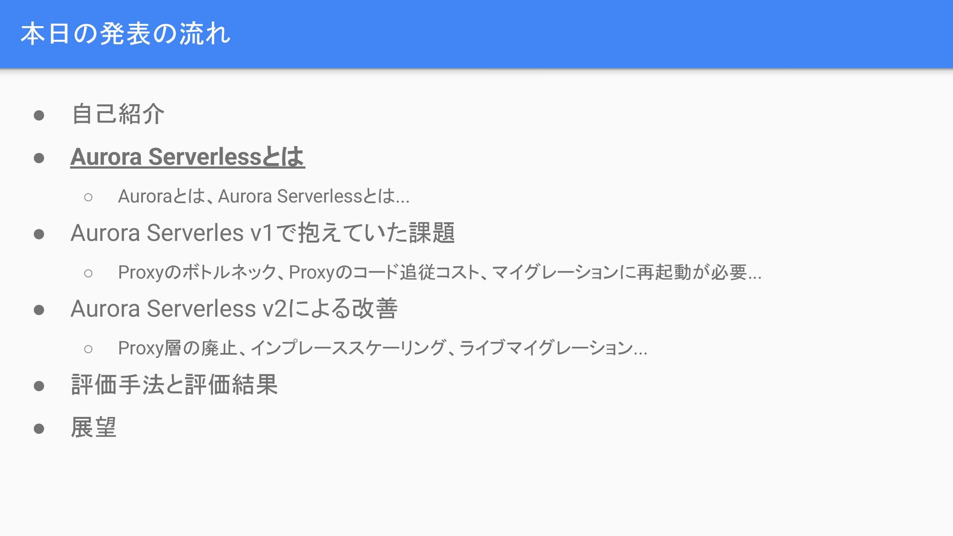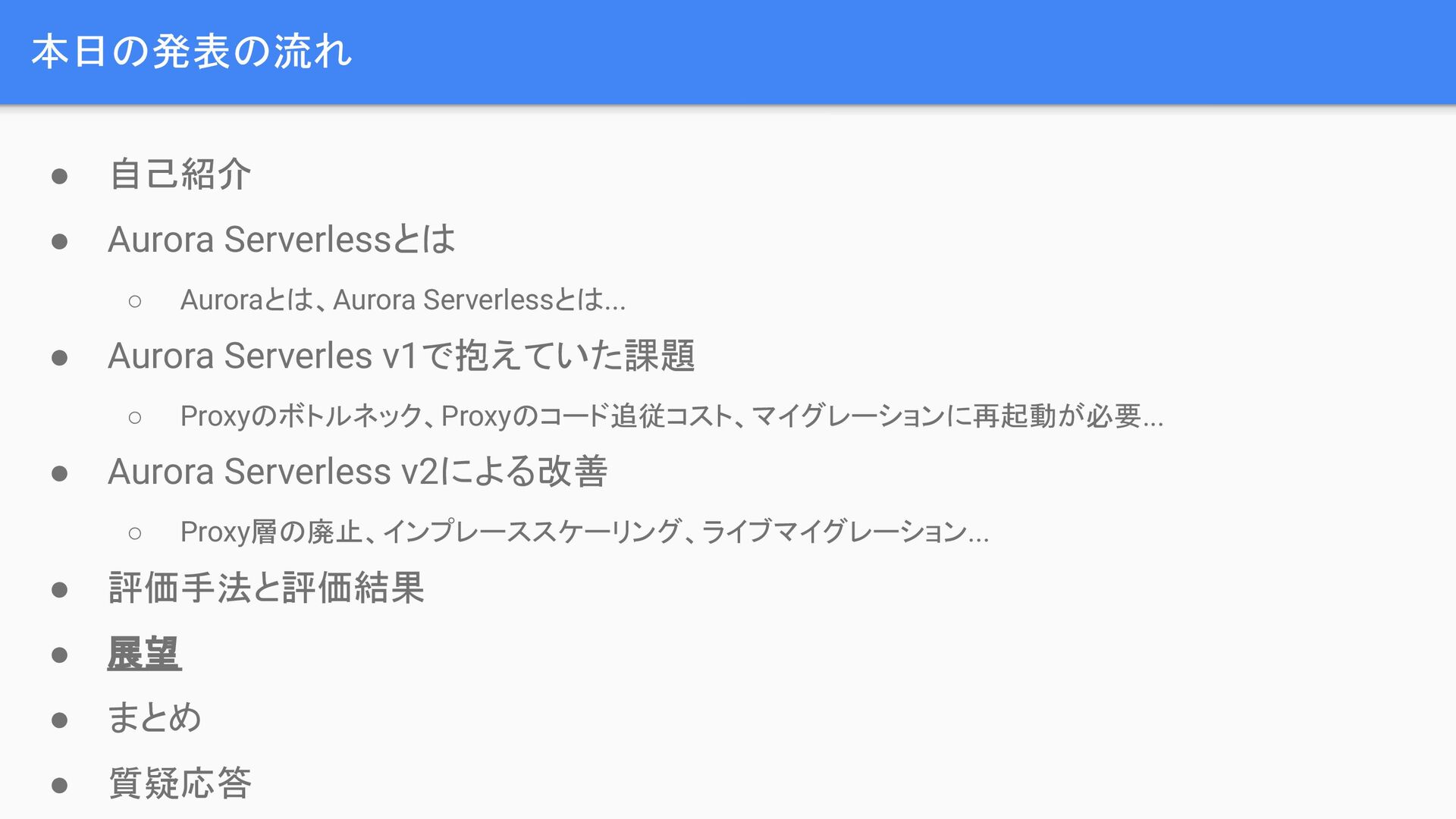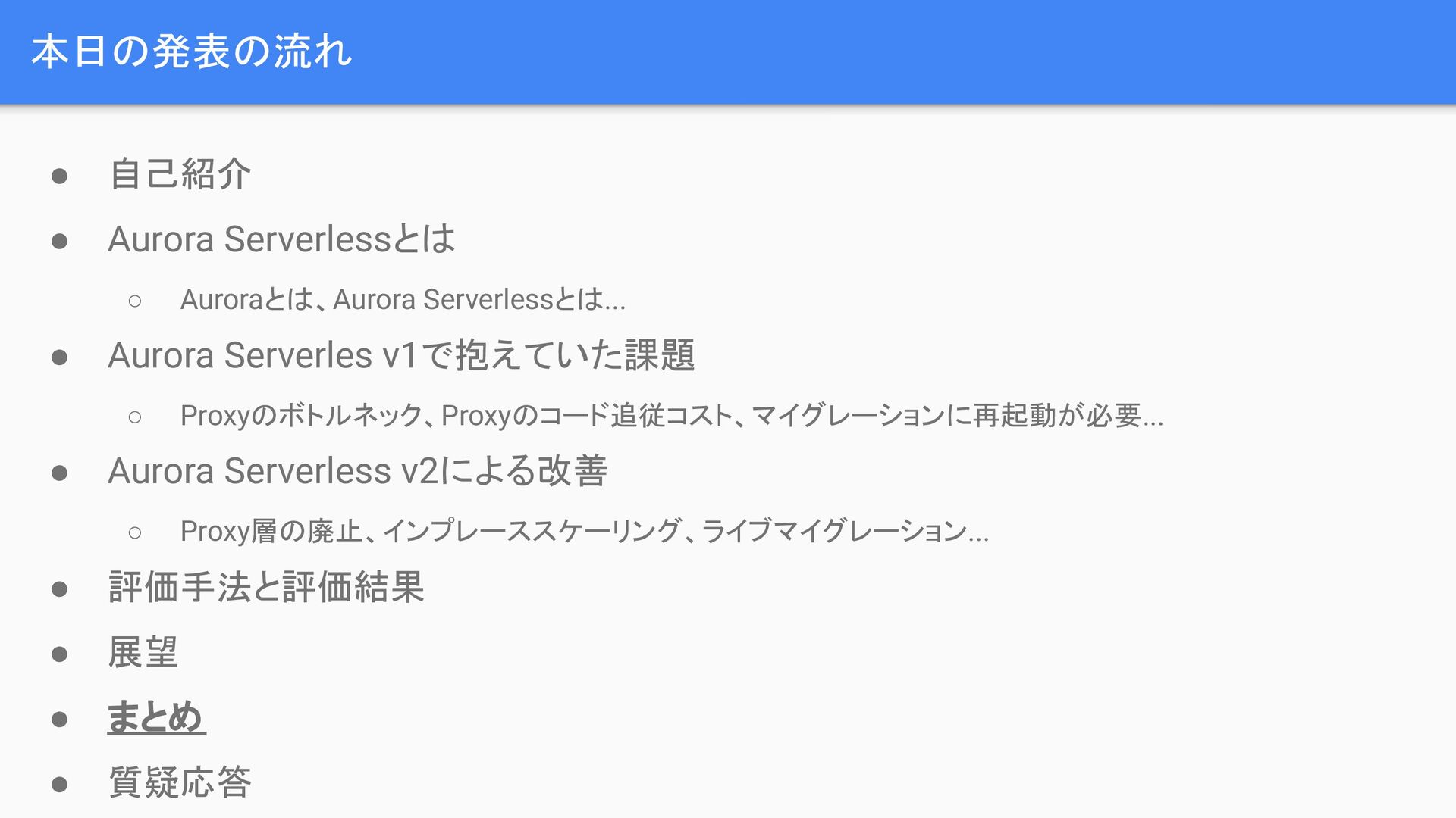 Aurora Serverles v1で抱えていた課題 ◦ Proxyのボトルネック、Proxyのコード追従コスト、マイグレーションに再起動が必要... • Aurora Serverless v2による改善 ◦ Proxy層の廃止、インプレーススケーリング、ライブマイグレーション... • 評価手法と評価結果 • 展望