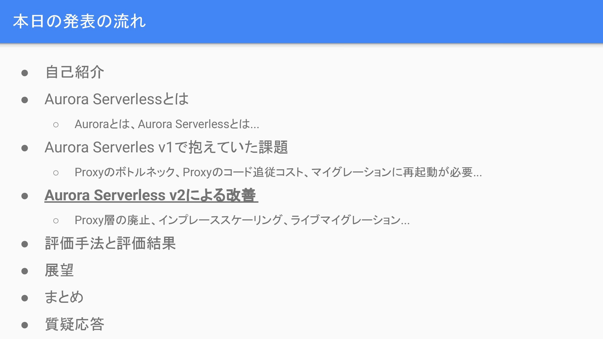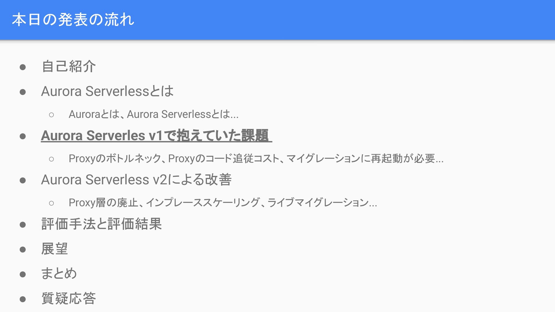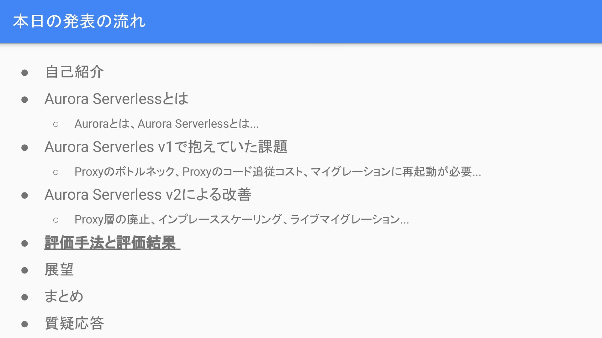 Aurora Serverles v1で抱えていた課題 ◦ Proxyのボトルネック、Proxyのコード追従コスト、マイグレーションに再起動が必要... • Aurora Serverless v2による改善 ◦ Proxy層の廃止、インプレーススケーリング、ライブマイグレーション... • 評価手法と評価結果 • 展望