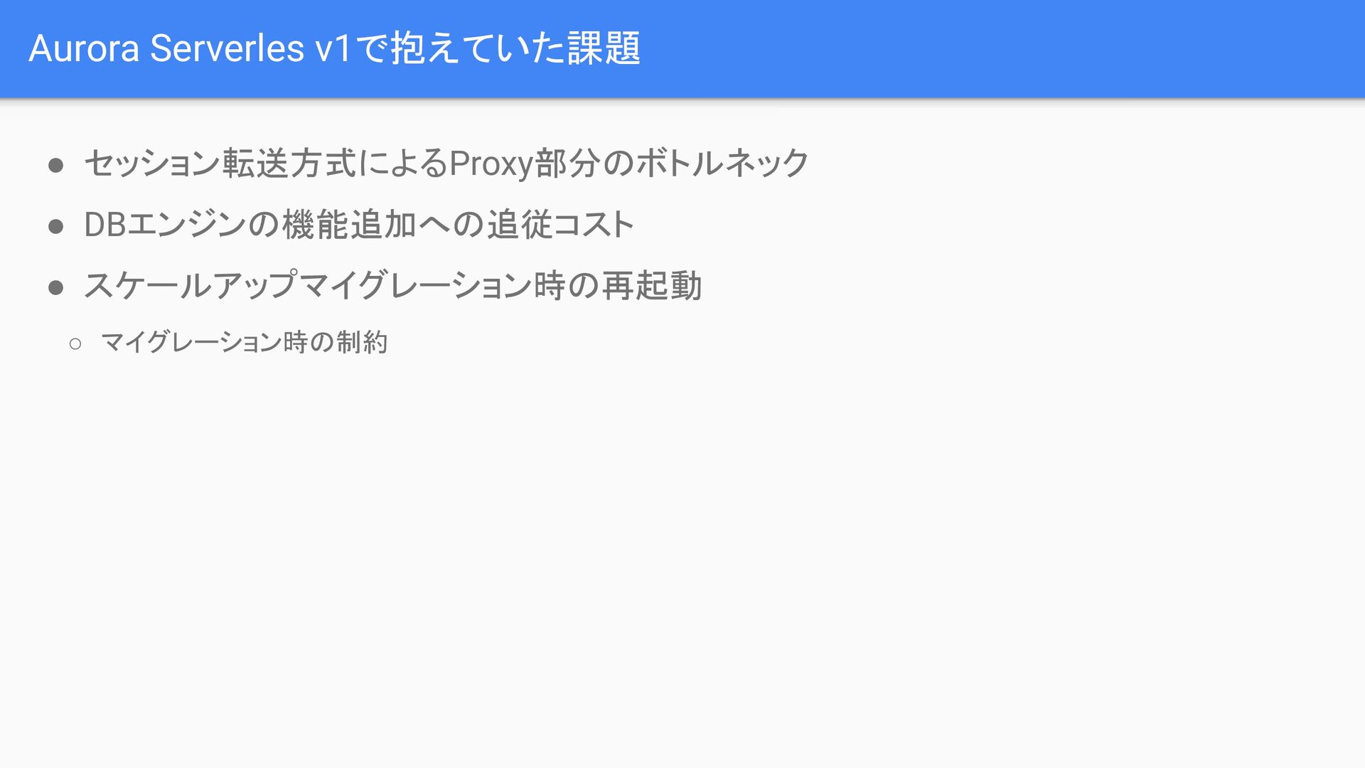 Aurora Serverles v1で抱えていた課題 • セッション転送方式によるProxy部分のボトルネック • DBエンジンの機能追加への追従コスト • スケールアップマイグレーション時の再起動 ◦