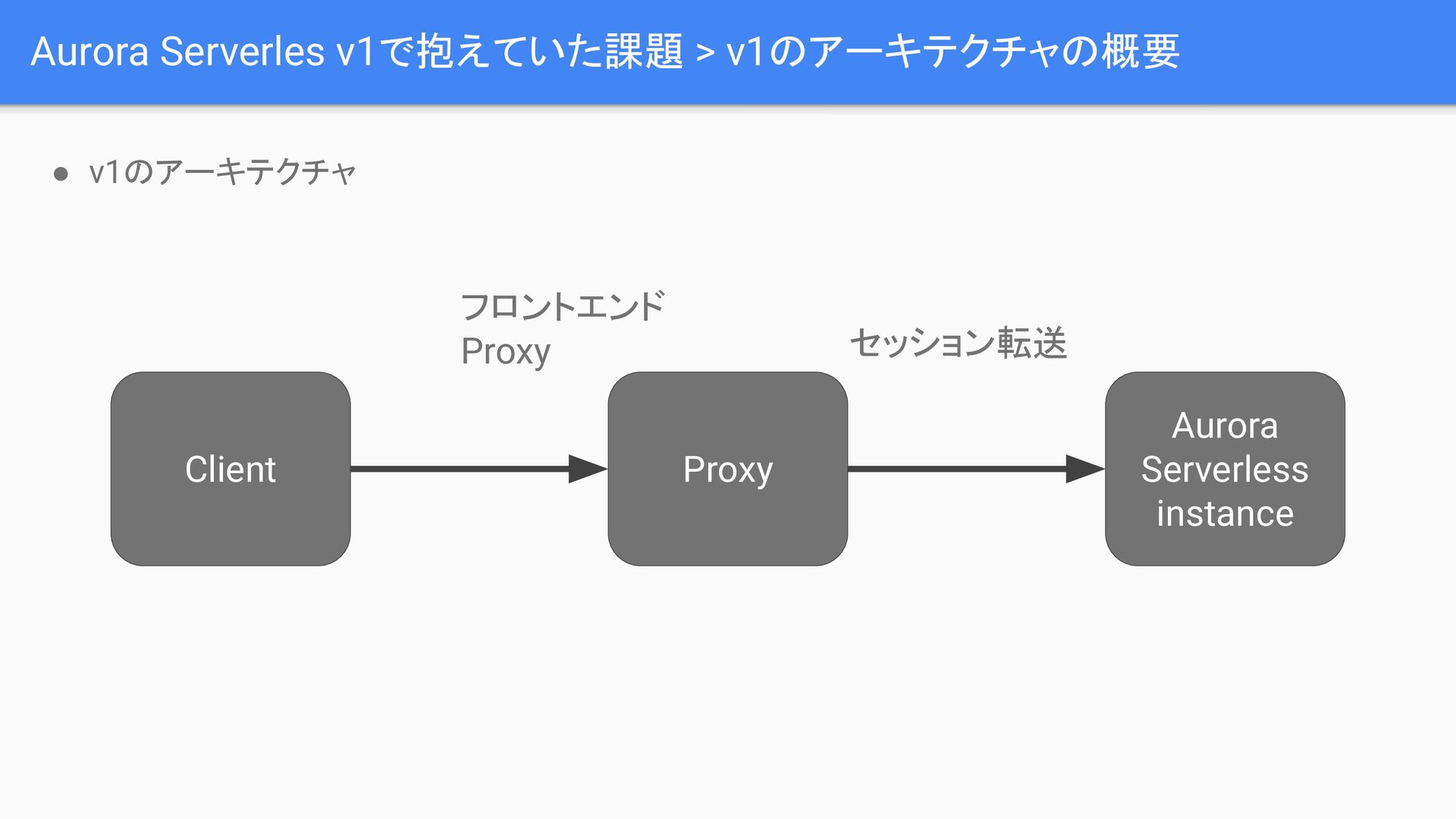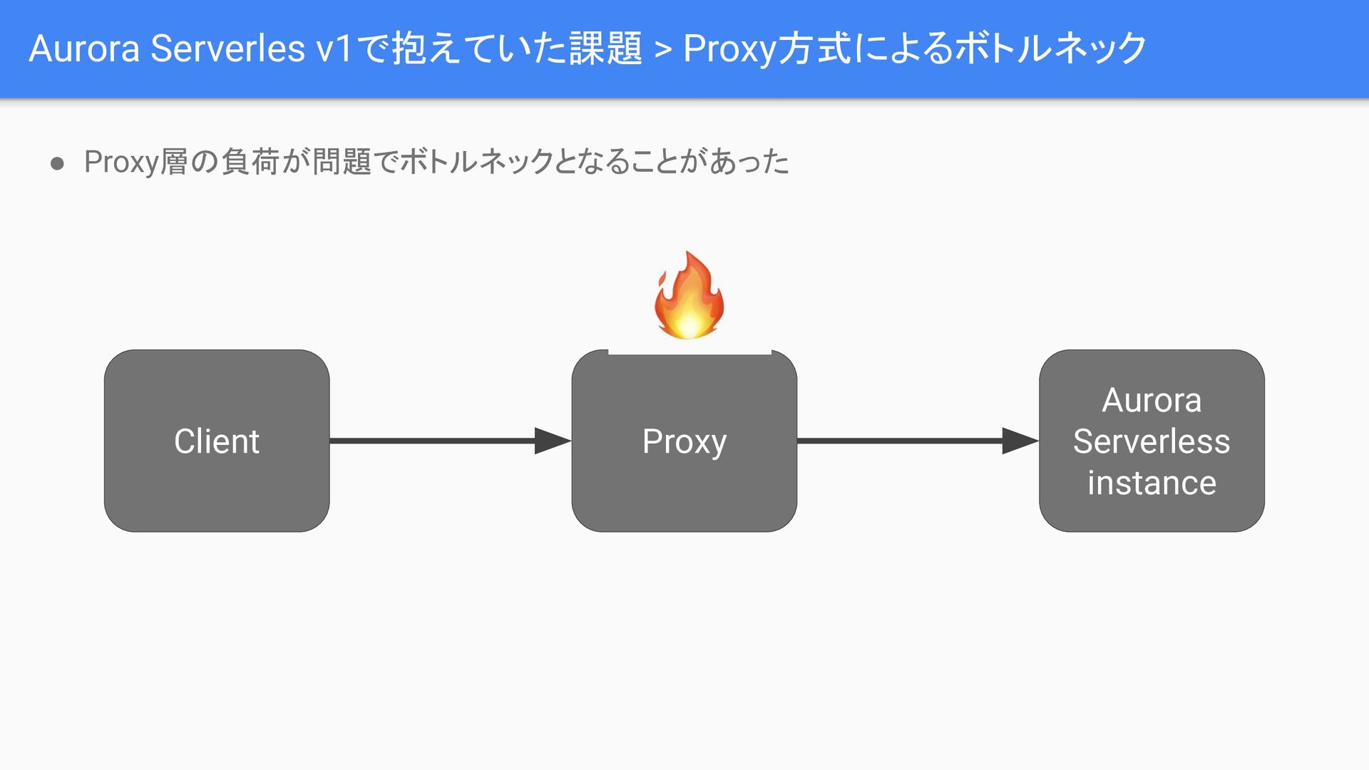 Aurora Serverles v1で抱えていた課題 > Proxy方式によるボトルネック • Proxy層の負荷が問題でボトルネックとなることがあった Proxy Aurora Serverless