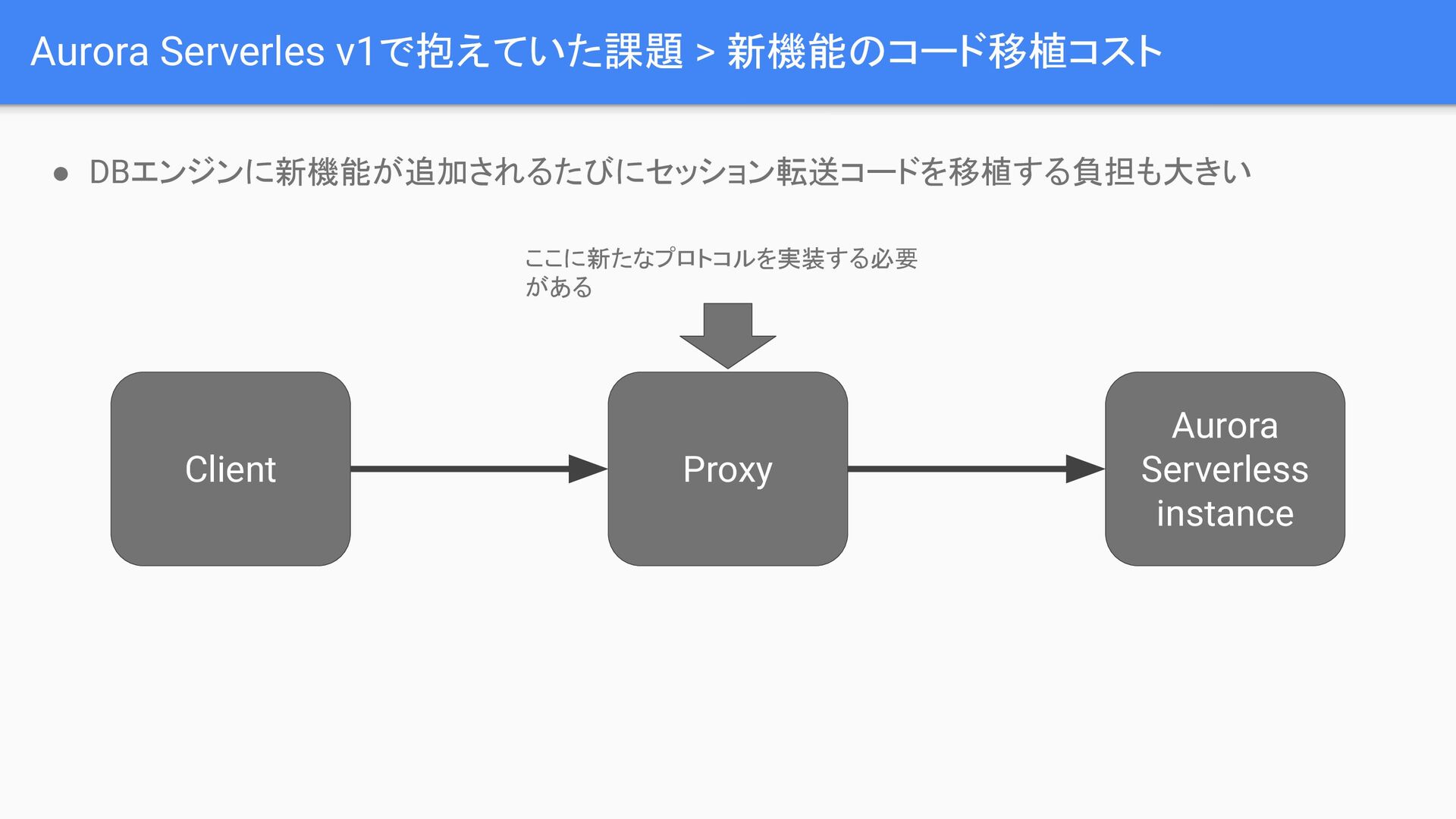 Aurora Serverles v1で抱えていた課題 > 新機能のコード移植コスト • DBエンジンに新機能が追加されるたびにセッション転送コードを移植する負担も大きい Proxy Aurora Serverless
