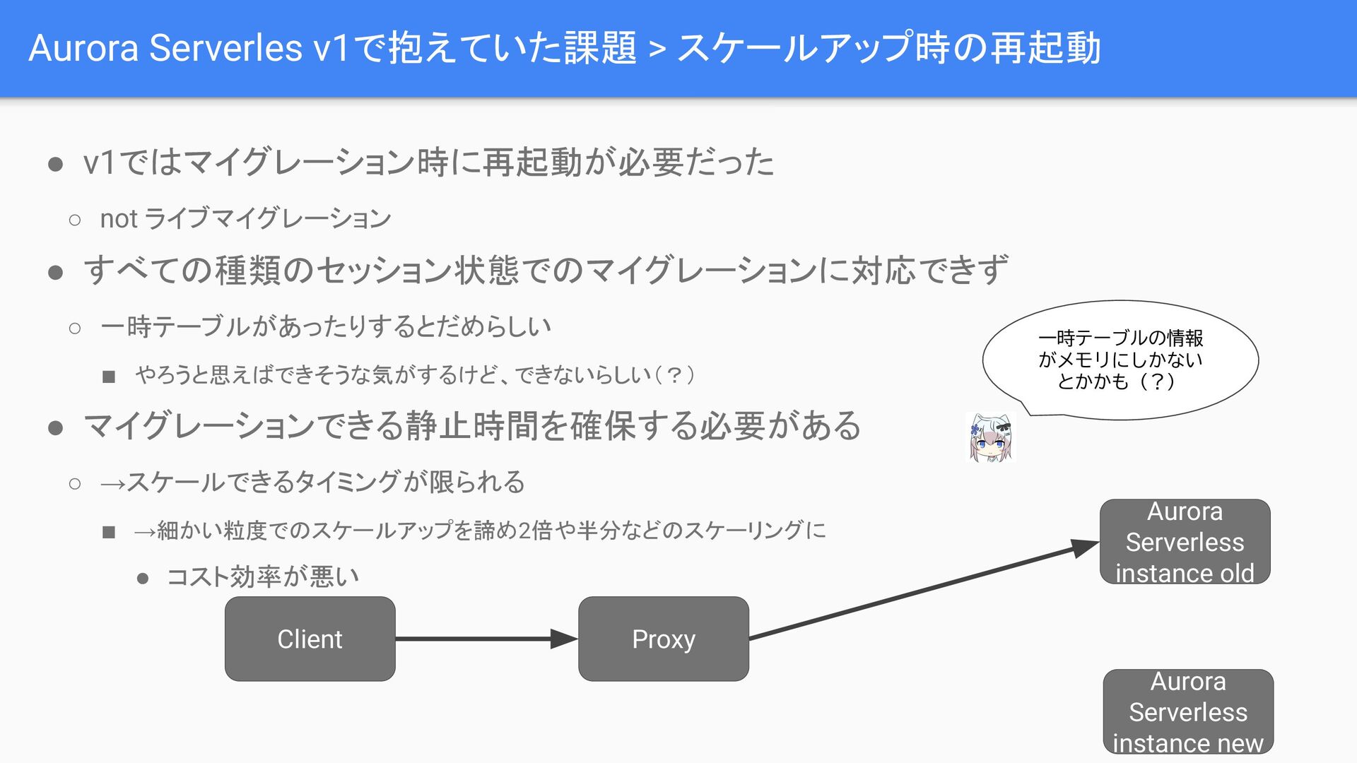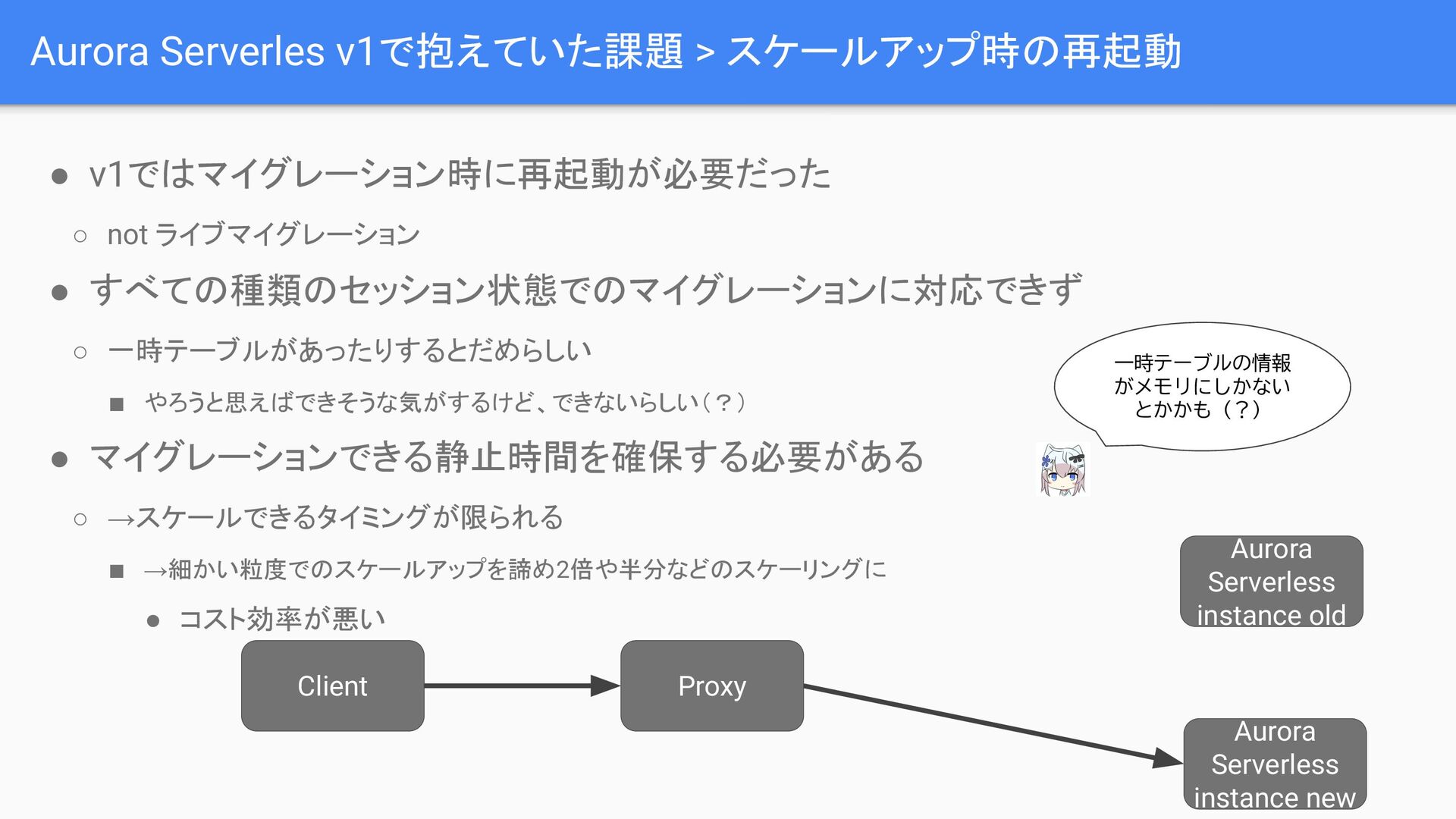 やろうと思えばできそうな気がするけど、できないらしい(?) • マイグレーションできる静止時間を確保する必要がある ◦ →スケールできるタイミングが限られる ▪ →細かい粒度でのスケールアップを諦め2倍や半分などのスケーリングに • コスト効率が悪い Aurora Serverles v1で抱えていた課題 > スケールアップ時の再起動 Proxy Aurora Serverless instance old Client Aurora Serverless instance new 一時テーブルの情報 がメモリにしかない とかかも(?)