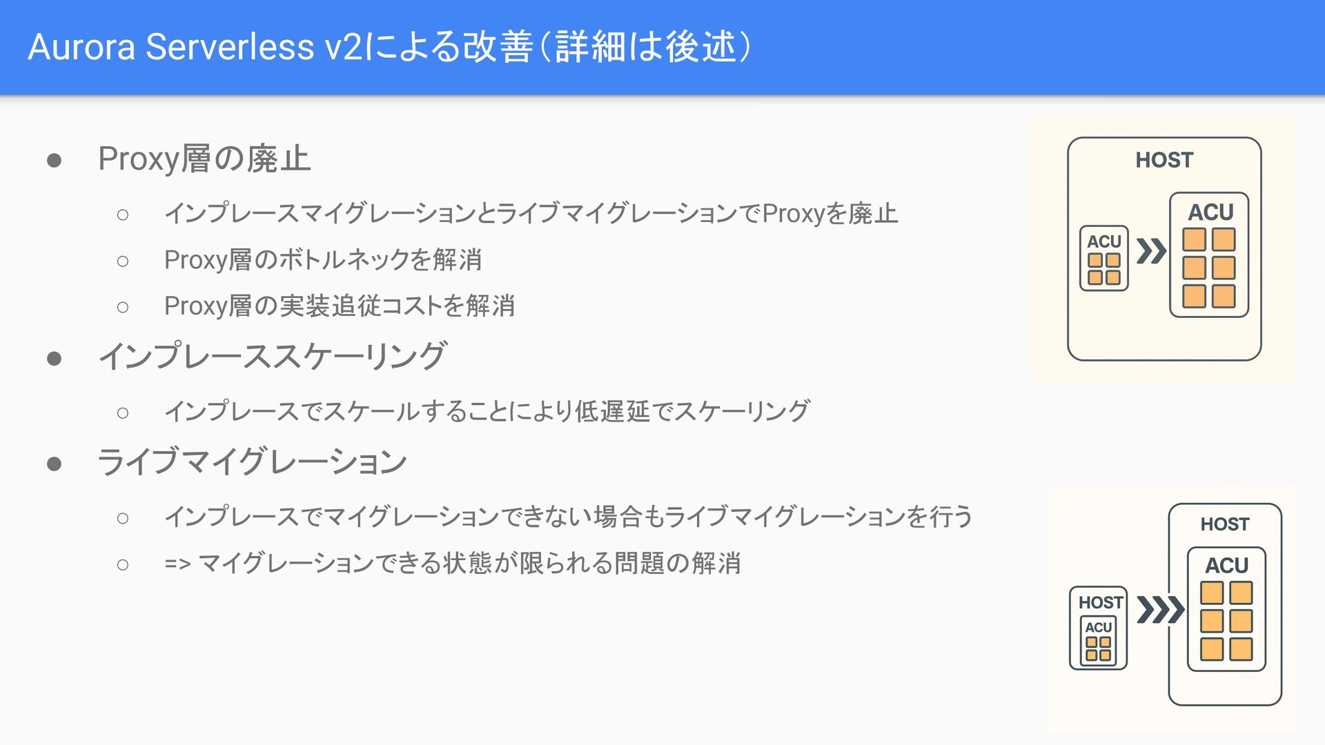 Aurora Serverless v2による改善(詳細は後述) • Proxy層の廃止 ◦ インプレースマイグレーションとライブマイグレーションでProxyを廃止 ◦ Proxy層のボトルネックを解消 ◦