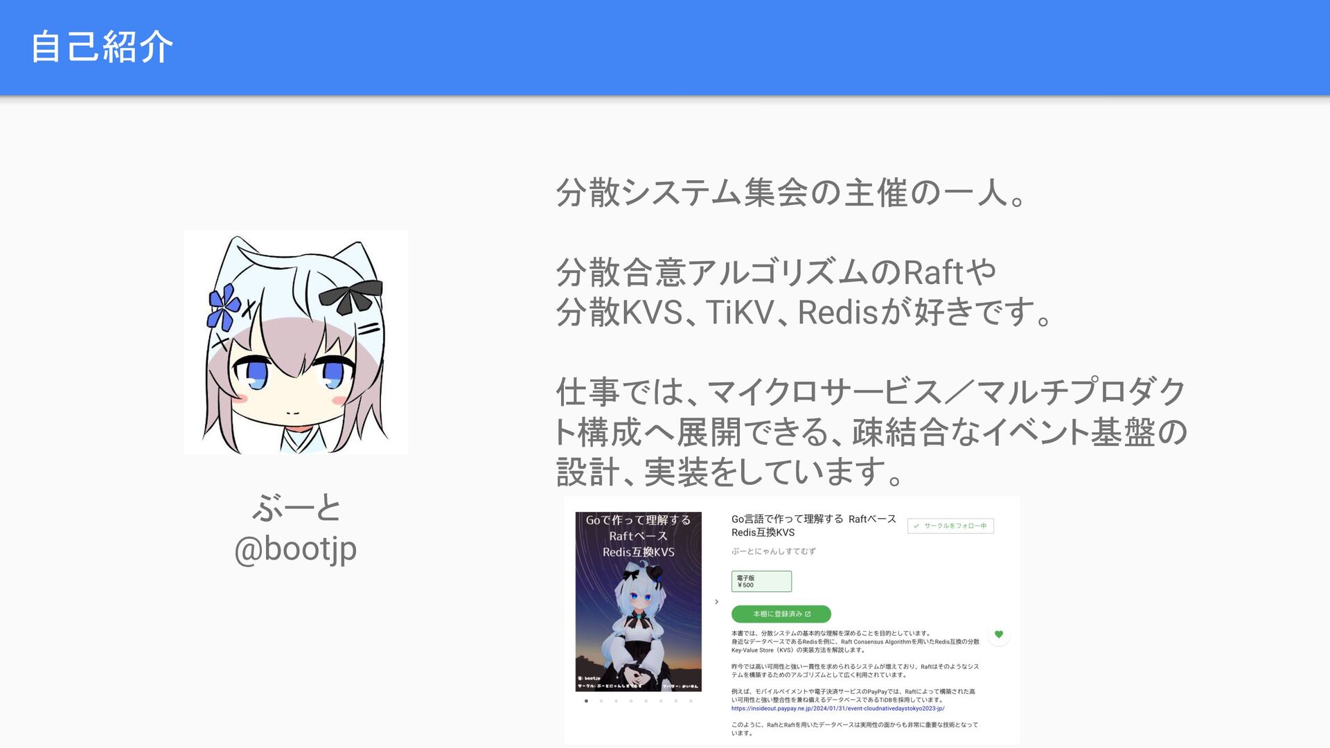 自己紹介 分散システム集会の主催の一人。 分散合意アルゴリズムのRaftや 分散KVS、TiKV、Redisが好きです。 仕事では、マイクロサービス/マルチプロダク ト構成へ展開できる、疎結合なイベント基盤の 設計、実装をしています。 ぶーと @bootjp