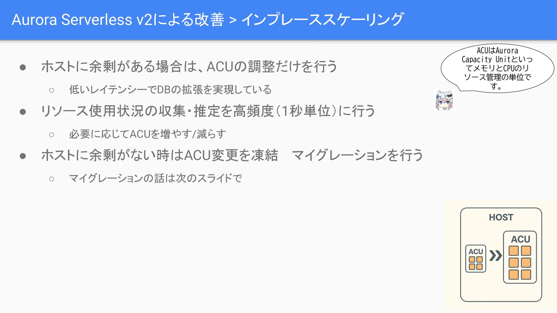 Aurora Serverless v2による改善 > インプレーススケーリング • ホストに余剰がある場合は、ACUの調整だけを行う ◦ 低いレイテンシーでDBの拡張を実現している •