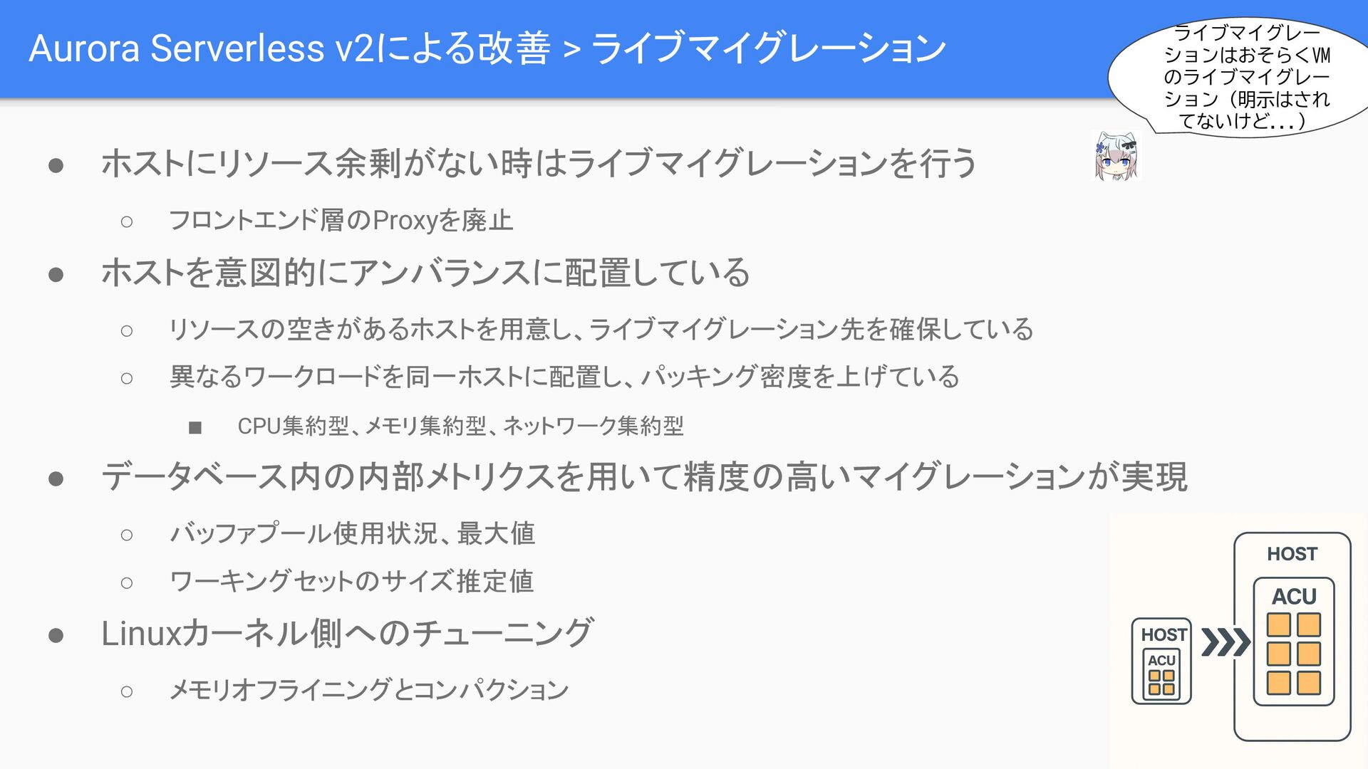 Aurora Serverless v2による改善 > ライブマイグレーション • ホストにリソース余剰がない時はライブマイグレーションを行う ◦ フロントエンド層のProxyを廃止 •
